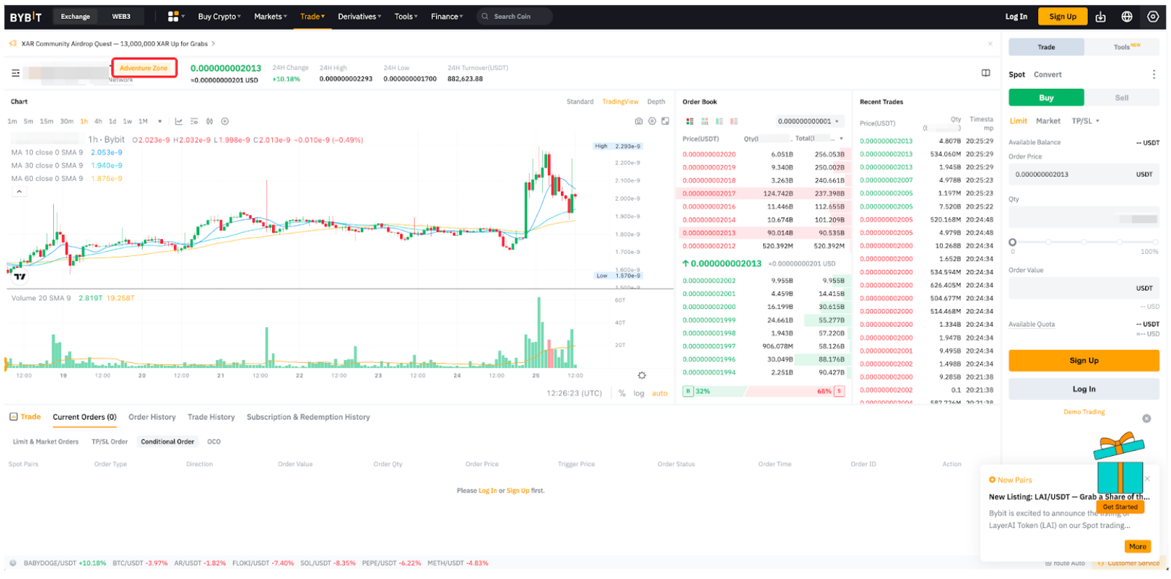 Alternatively, type the trading pair of your choice in the search bar, and open its trading page. If the trading pair belongs to the Adventure Zone, the Adventure Zone mention will appear on the right side of the trading pair name.