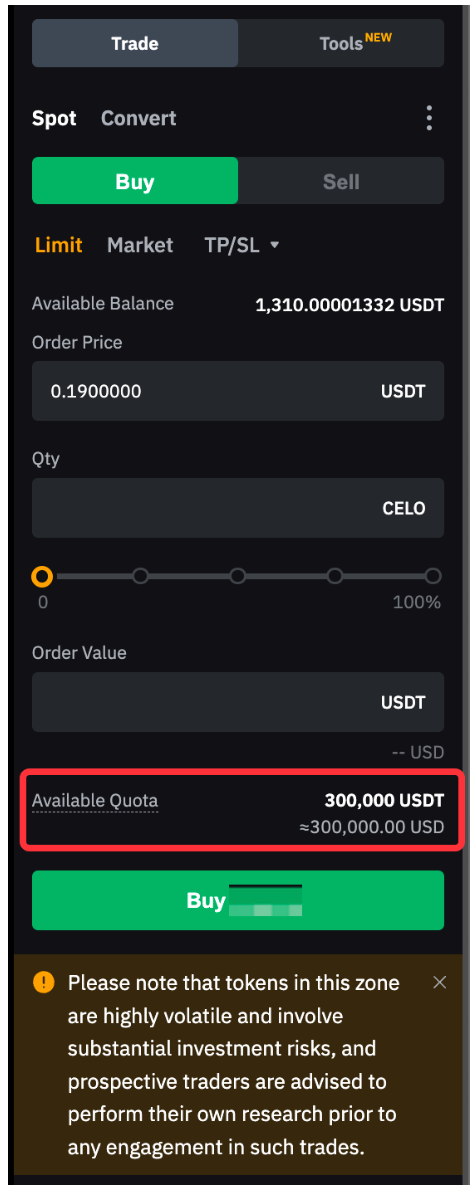 You can find this information on the Available Quota section of the Trading Page. For example, if the Available Quota for coin ABC is 300,000 USDT and the price of coin ABC is 0.5 USDT, the maximum quantity of coin ABC that you can hold in your account is 600,000 coins (calculated as 300,000 USDT ÷ 0.5 USDT = 600,000 coins).