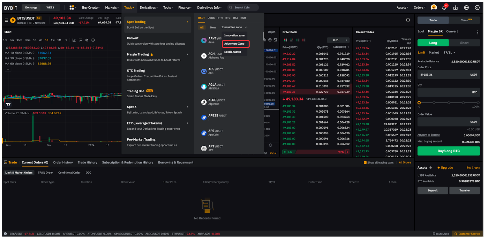 To access the Adventure Zone and its trading pairs, click on Trade → Spot Trading, and in the drop-down menu, select Adventure Zone