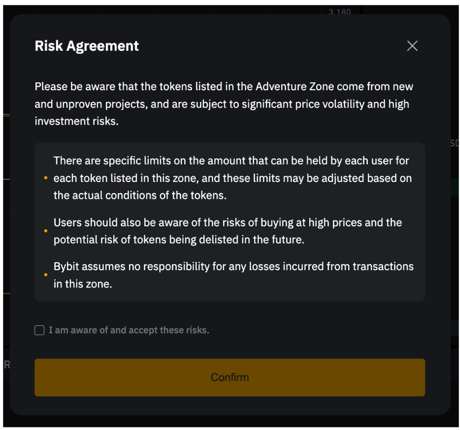 4. Delisting Risk: Bybit reserves the right to delist projects in the Adventure Zone if they pose excessive risks to traders. Your trading opportunities may be limited once the project is delisted.
