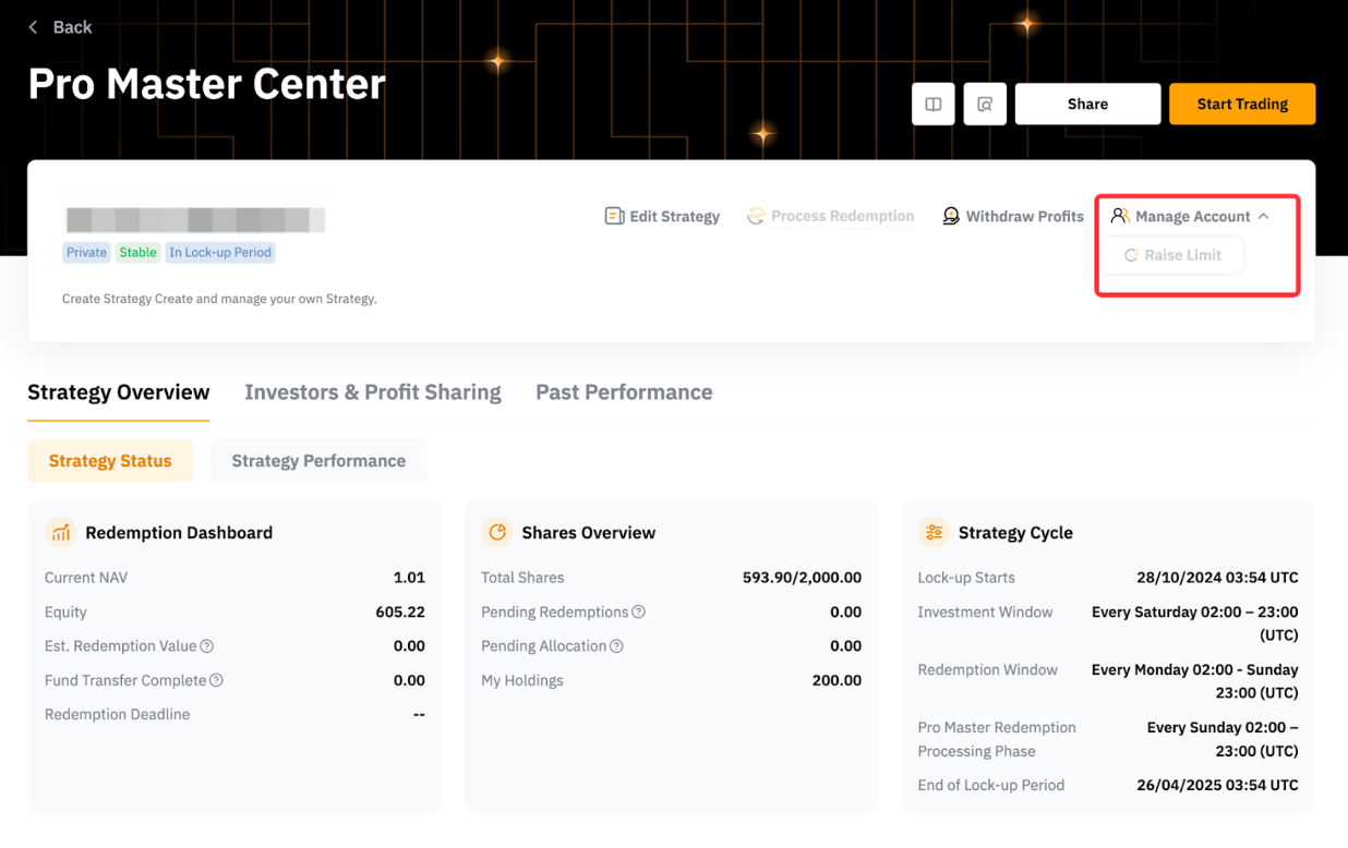 You can raise the share limit to accommodate more investors’ funds during the Investment Window from Manage Account → Raise Limit. When you choose to increase the capacity, you must also contribute the additional Master Balance to complete the expansion successfully.