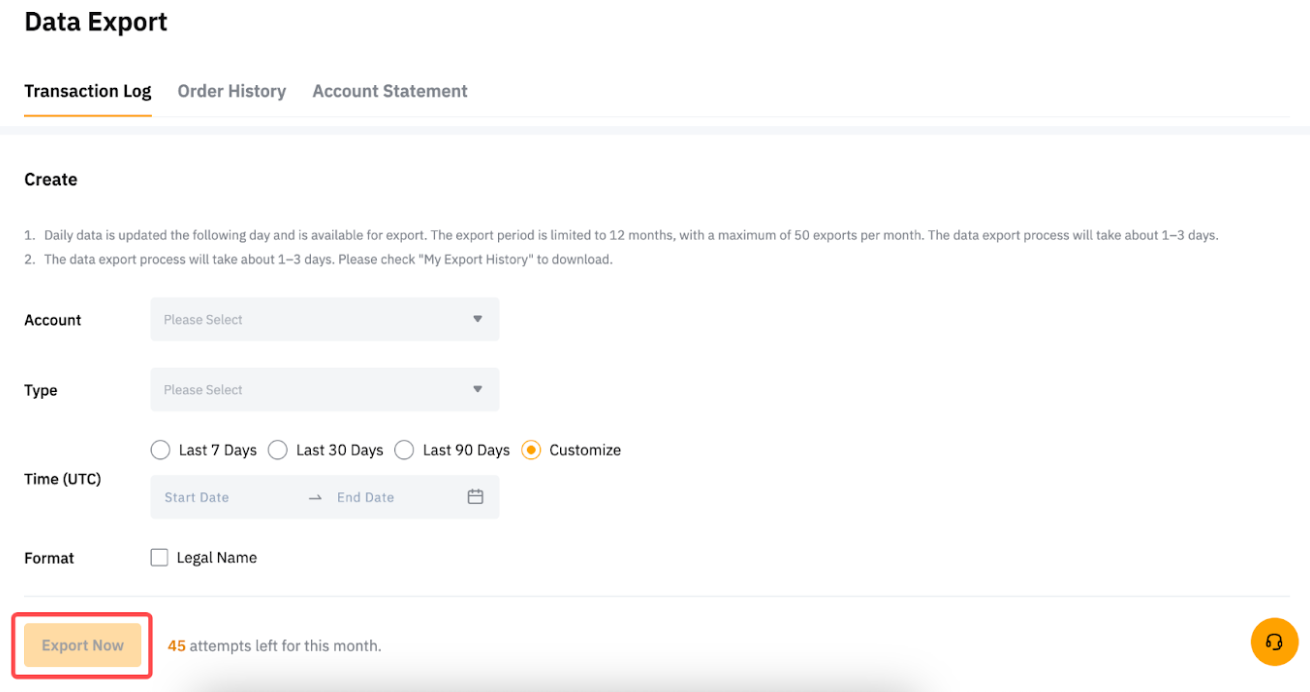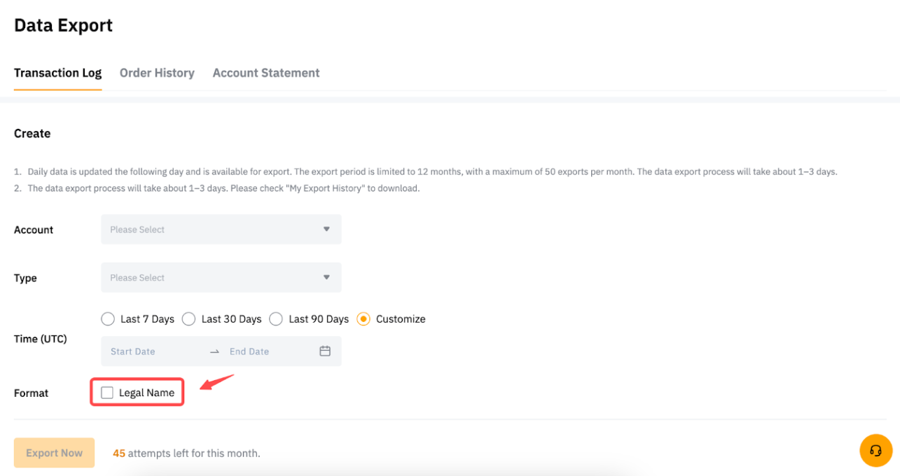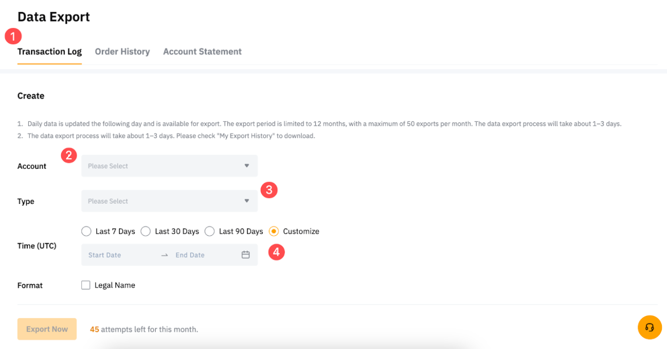 — Some data may not be available in the account statement, such as the Spot or Derivatives Order history. To export these data, please go directly to each Product History page and click on the Export button on the top right corner