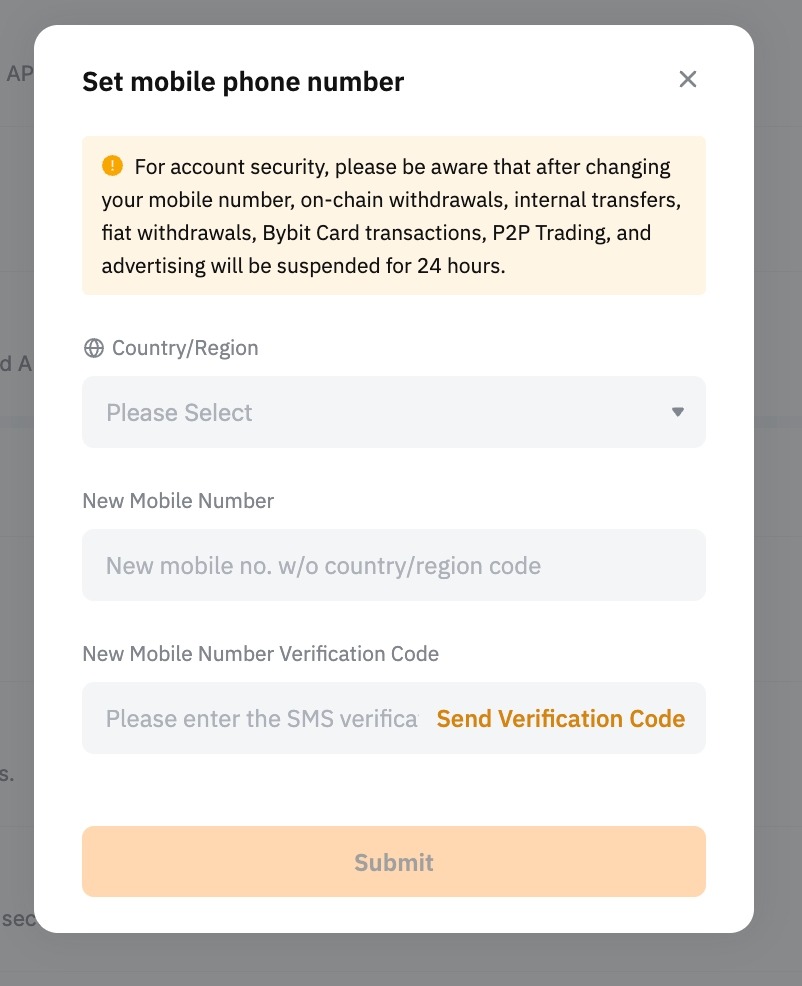 Step 2: A confirmation window will pop-up, notifying you in advance that there will be 24-hour service restrictions for Crypto & Fiat withdrawals, internal transfers, Bybit Card transactions, P2P trading and advertising after changing your mobile number. Once you’ve understood, click on Change Mobile to continue.