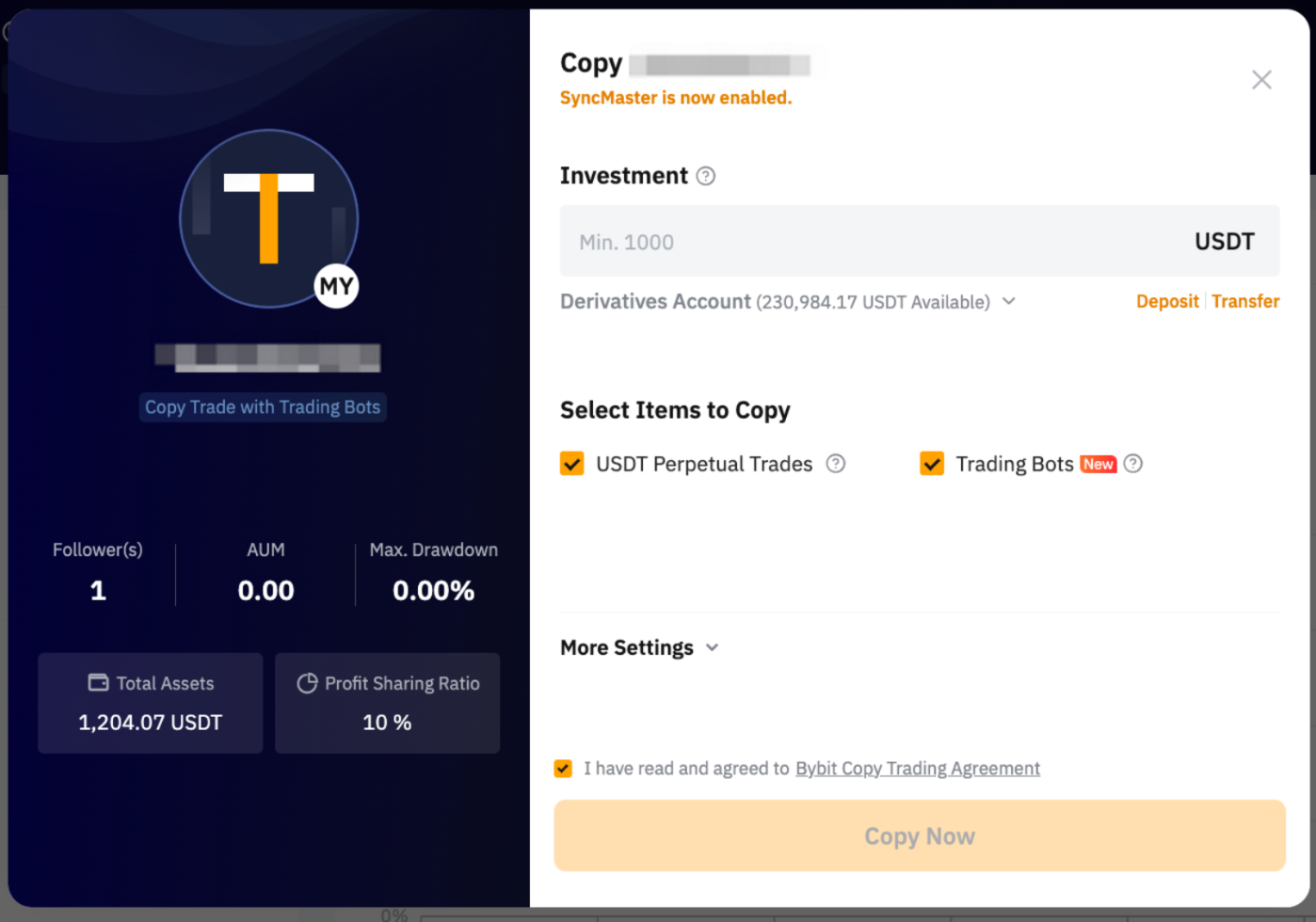 Esta es la cantidad total que invertirá en copiar este Master Trader. Puede introducir la cantidad de acuerdo con el saldo de su cuenta Bybit y también elegir qué saldo de cuenta utilizar, ya sea una cuenta de trading unificada o una cuenta de fondos.