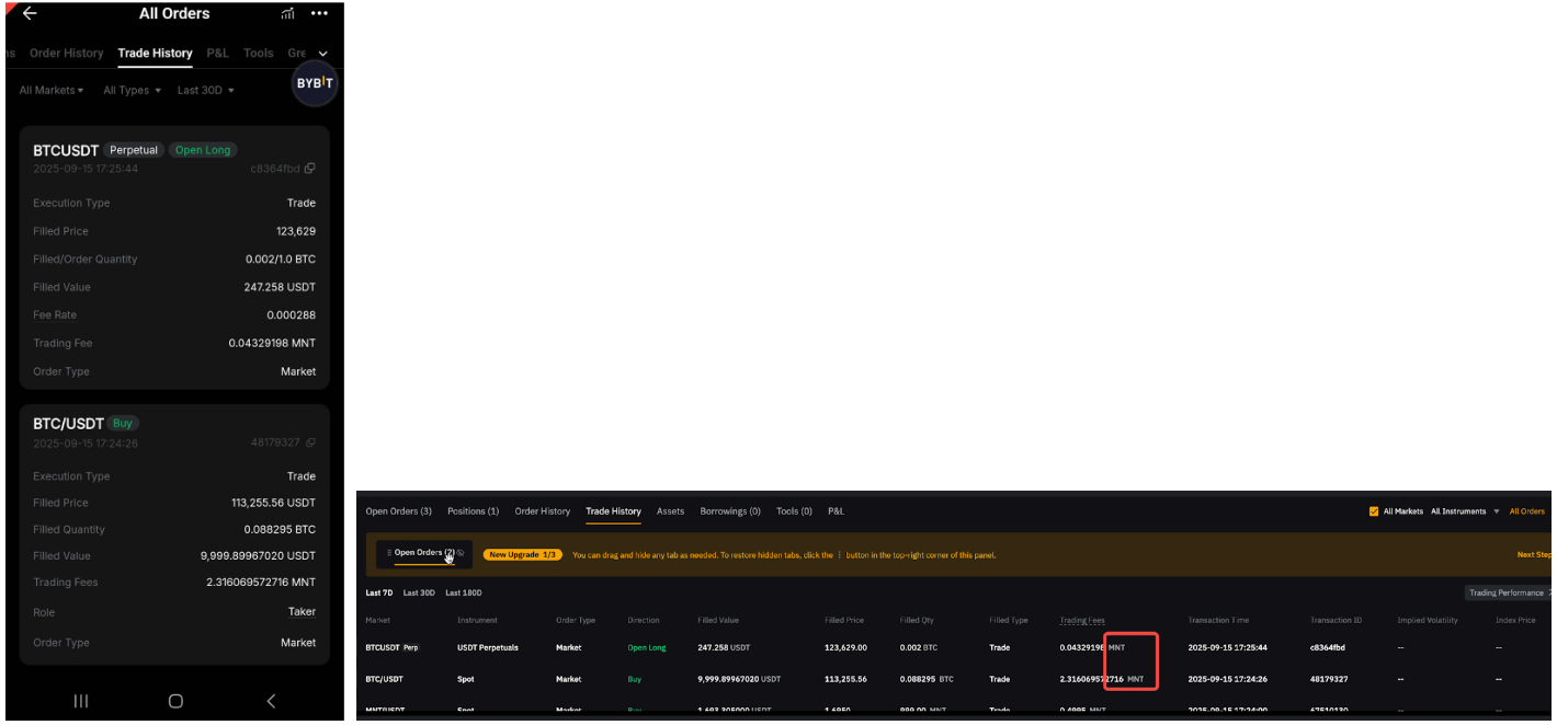 — En el PyG cerrado y realizado, cualquier parte de las tarifas pagada en MNT se convertirá y registrará como USDT o USDC, en función del tipo de contrato.