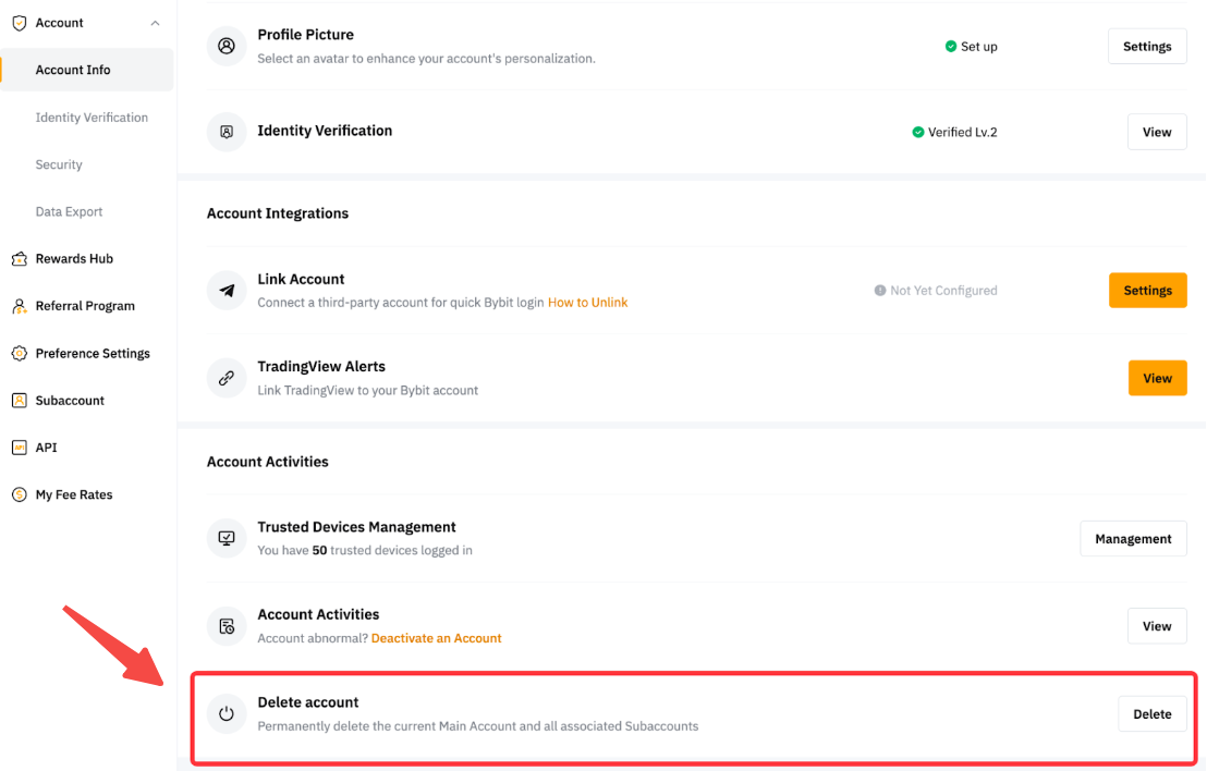 Bybit ha lanzado una función de eliminación de cuentas de autoservicio, que permite a los usuarios eliminar sus cuentas por sí mismos a través de la página Cuenta y seguridad.