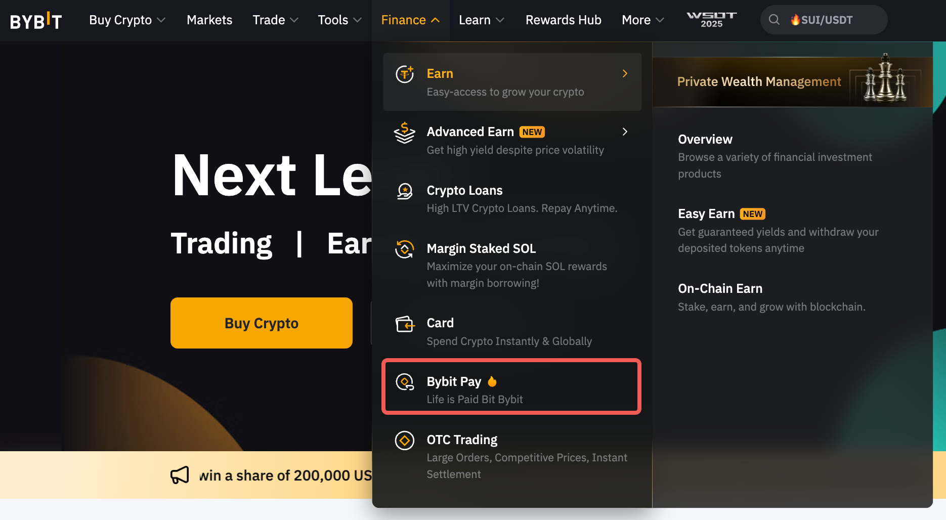 Paso 1: Haga clic en Finanzas en la esquina superior izquierda de la barra de navegación en la página Bybit y, a continuación, seleccione Bybit Pay para entrar en la página Bybit Pay.