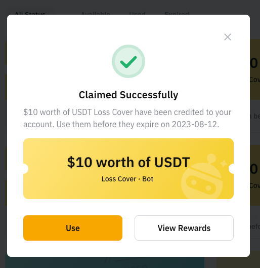 Una vez que hayas reclamado con éxito tu voucher, puedes hacer clic en Ver recompensas para consultar los detalles. Si deseas utilizarlo inmediatamente, haz clic en Usar. Se te redirigirá a la página de Trading bot, donde podrás crear un bot.