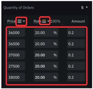 Bybit ofrece cuatro (4) tipos de Cantidad de orden y distribución de precios para la función de orden escalada: plana, ascendente, descendente y personalizada.
