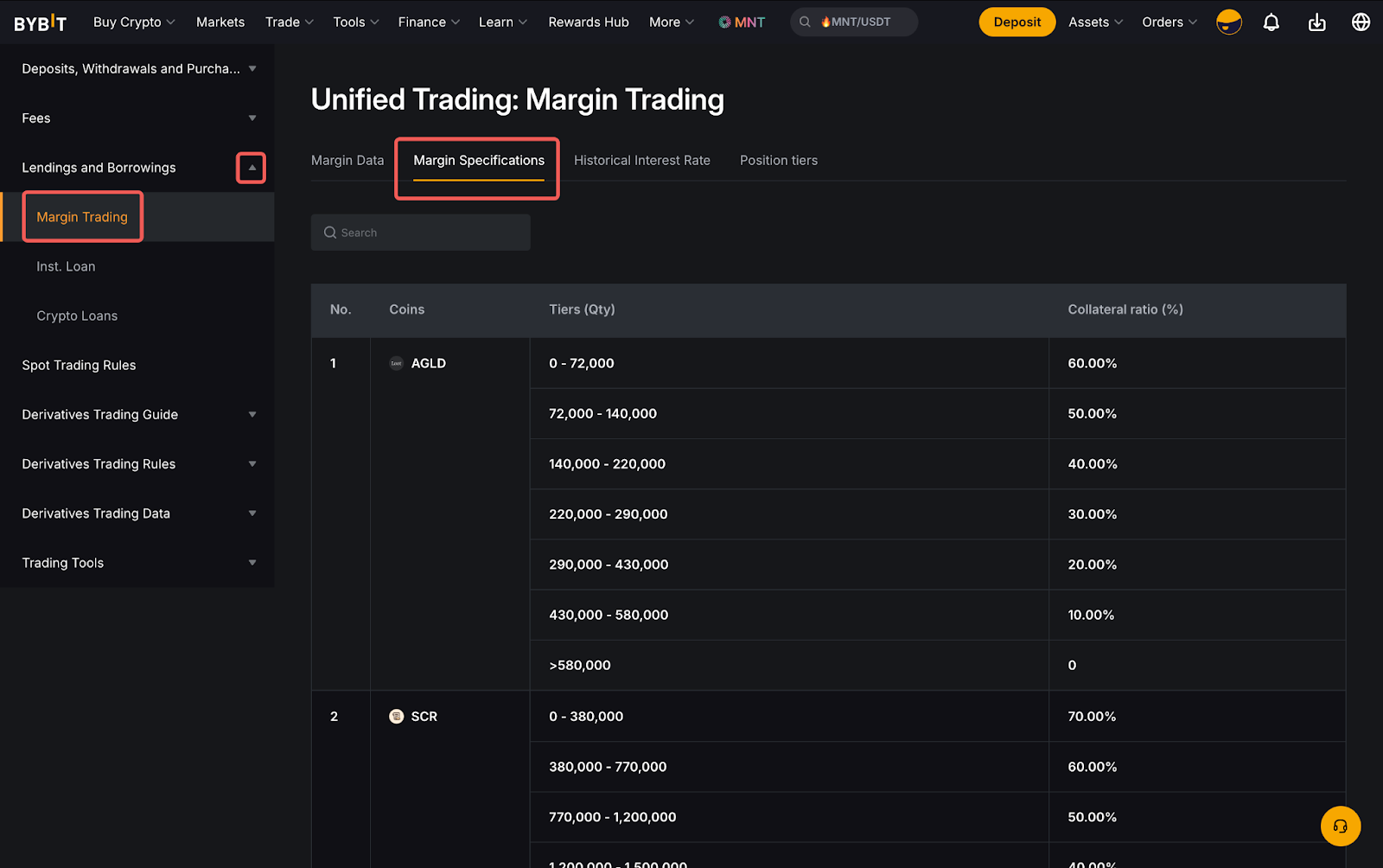 Para ver los detalles de la garantía y los activos prestables, vaya a la página de Derivatives Trading y haga clic en Información de Derivatives. A continuación, haga clic en Préstamos y empréstitos → Margin Trading → Especificación de margen.