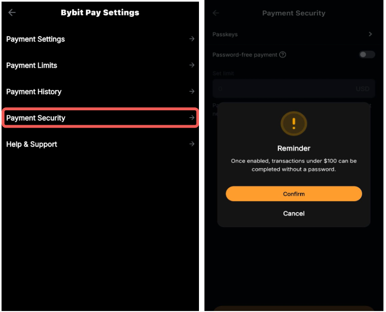 Puede activar los pagos sin contraseña desde sus Ajustes de Bybit Pay → Seguridad de pago.