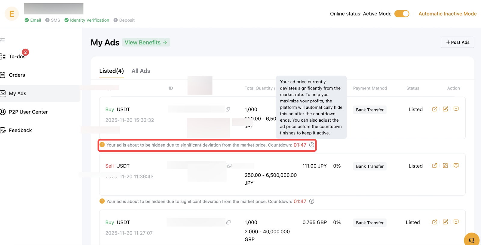 En la aplicación, ve a Trading P2P → AnunciosTodo para ver la lista de anuncios eliminados u ocultos. A continuación, haz clic en Estado para ver los motivos.