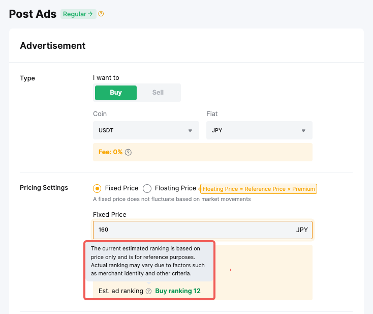 Actualmente, no se cobran cargos a los anunciantes por publicar anuncios. Sin embargo, tenga en cuenta que los usuarios están sujetos a cargos por transacción que pueden variar según la moneda del fiduciario, el método de pago, el nivel de anunciante o el tipo de anuncio. Consulte este artículo para ver las tarifas aplicables a P2P.