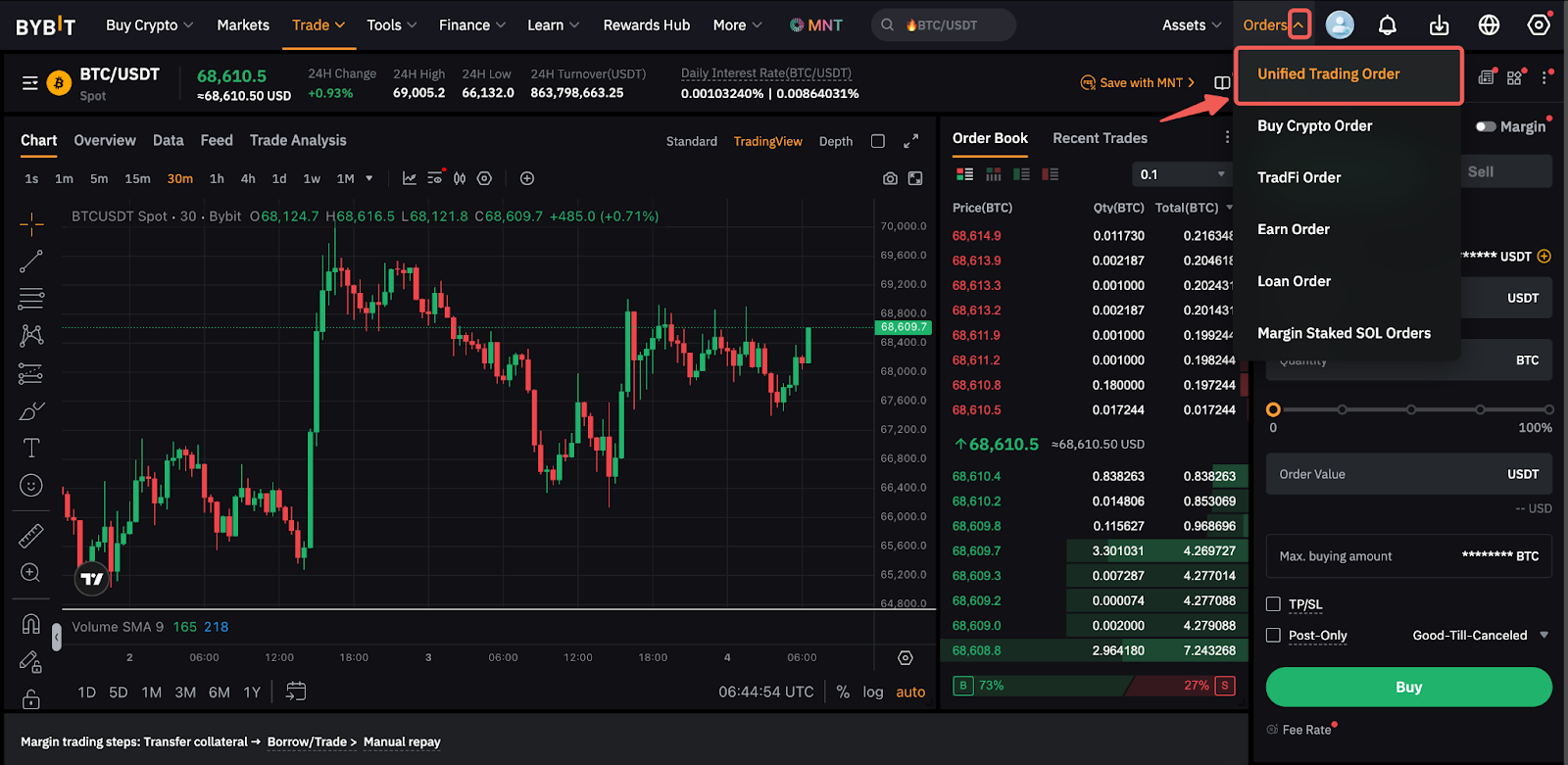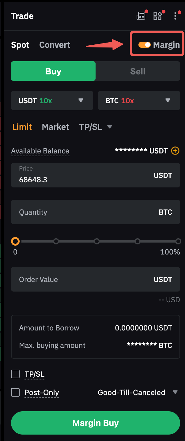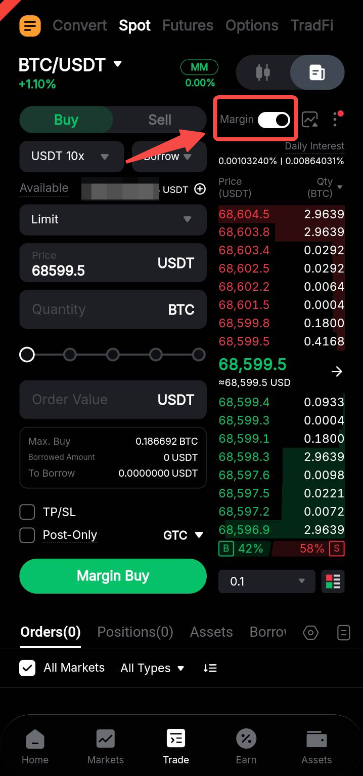 Sí, pedir fondos prestados para hacer trading en el mercado spot es posible a través de la función de margin trading en spot en el modo de margen cruzado o de margen de cartera. Puede activar esto pulsando el botón de Margen en la zona de órdenes.