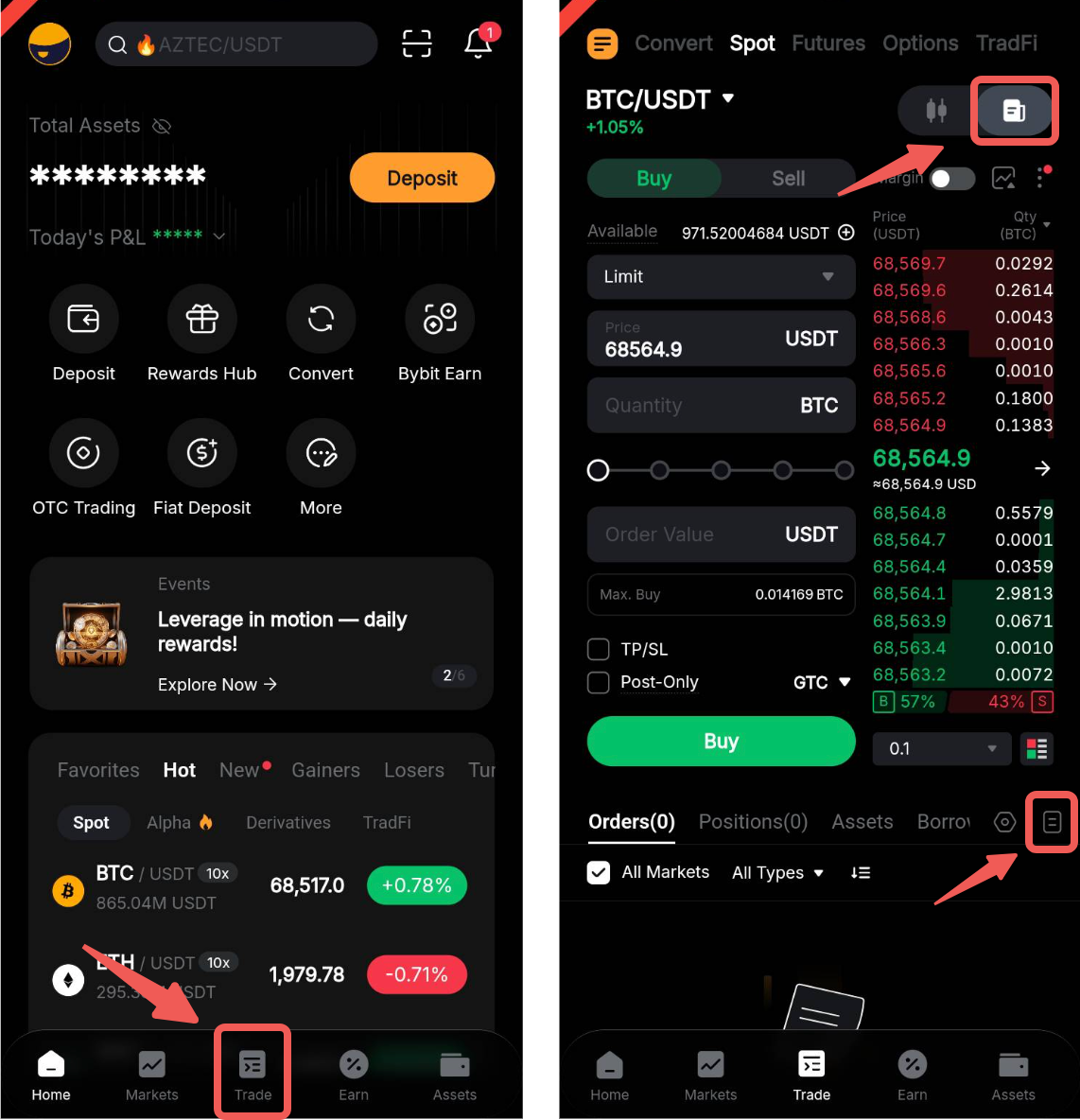 En la aplicación de Bybit, ve a Trade → Spot y activa el botón Trade para acceder a la Zona de órdenes. Toca el icono Historial de órdenes en la esquina superior derecha de la pestaña Posición para ver tu historial de órdenes y tu historial de trading.