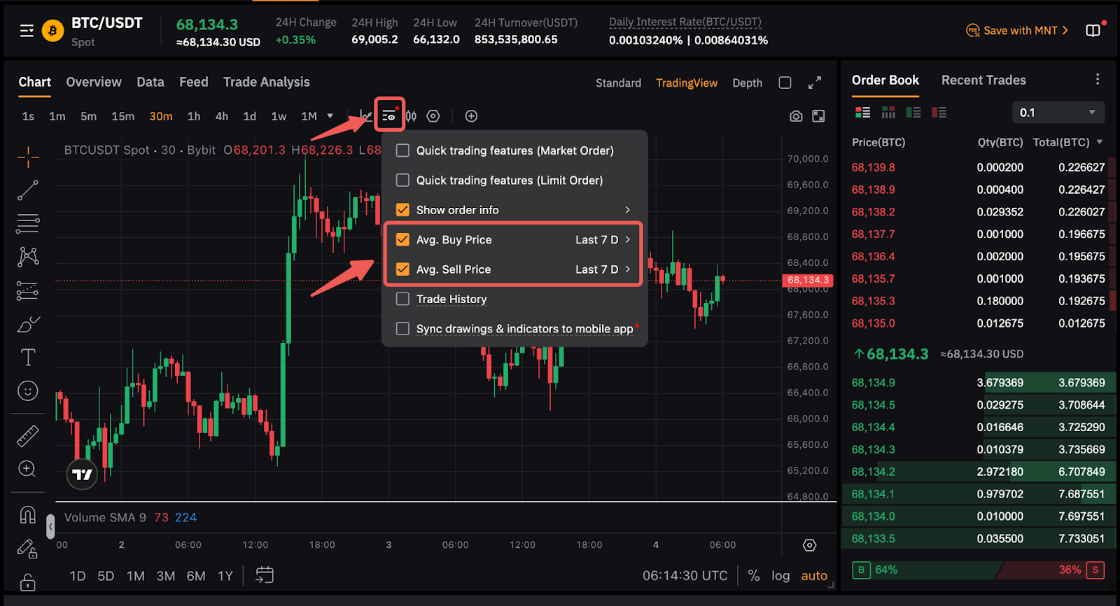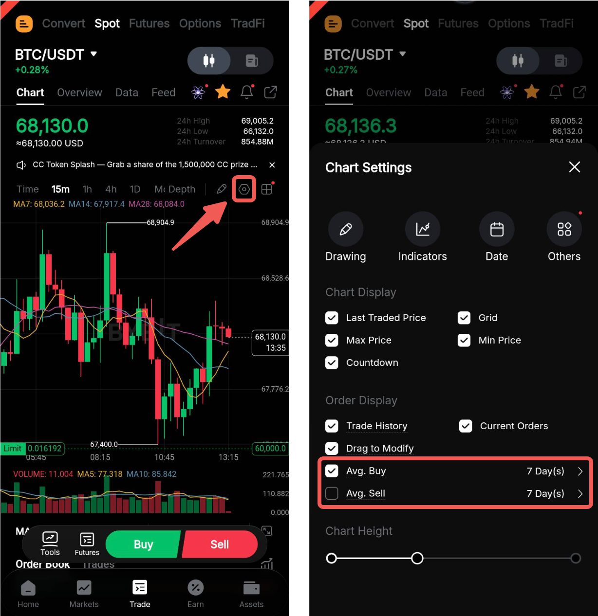 Cuando se opera en Spot, puede ver el precio promedio de sus órdenes de compra y venta directamente en el gráfico de trading. Para activarlo, haga clic en el icono de visualización y marque el precio promedio que desea ver. También puede seleccionar el periodo sobre el que se calculará la cotización media (últimos 7, 30, 60 ó 90 días). Tenga en cuenta que el precio promedio se calculará desde el día actual hasta el último día del periodo seleccionado.