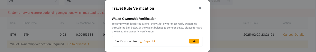 Step 1: Go to your Deposit History, look for the deposit with Wallet Ownership Verification Required, and click on Go to process