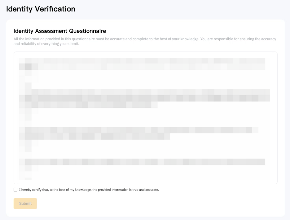 En circunstancias normales, la evaluación de identidad se completará automáticamente justo después de que hayas completado tu prueba de identidad. Sin embargo, algunos usuarios deberán completar un cuestionario de evaluación de identidad. Los usuarios son responsables de garantizar que toda la información enviada sea precisa y fiable.