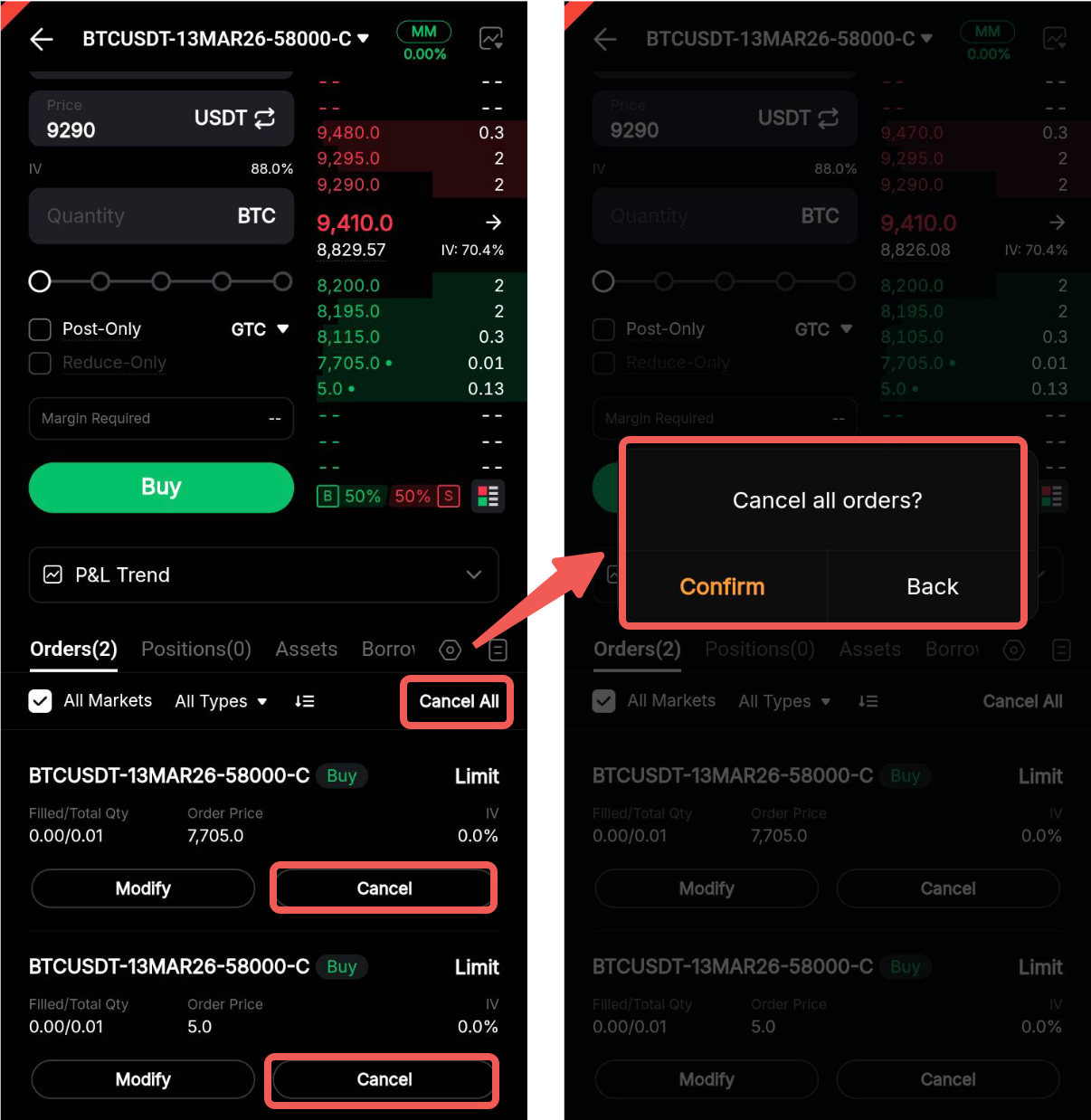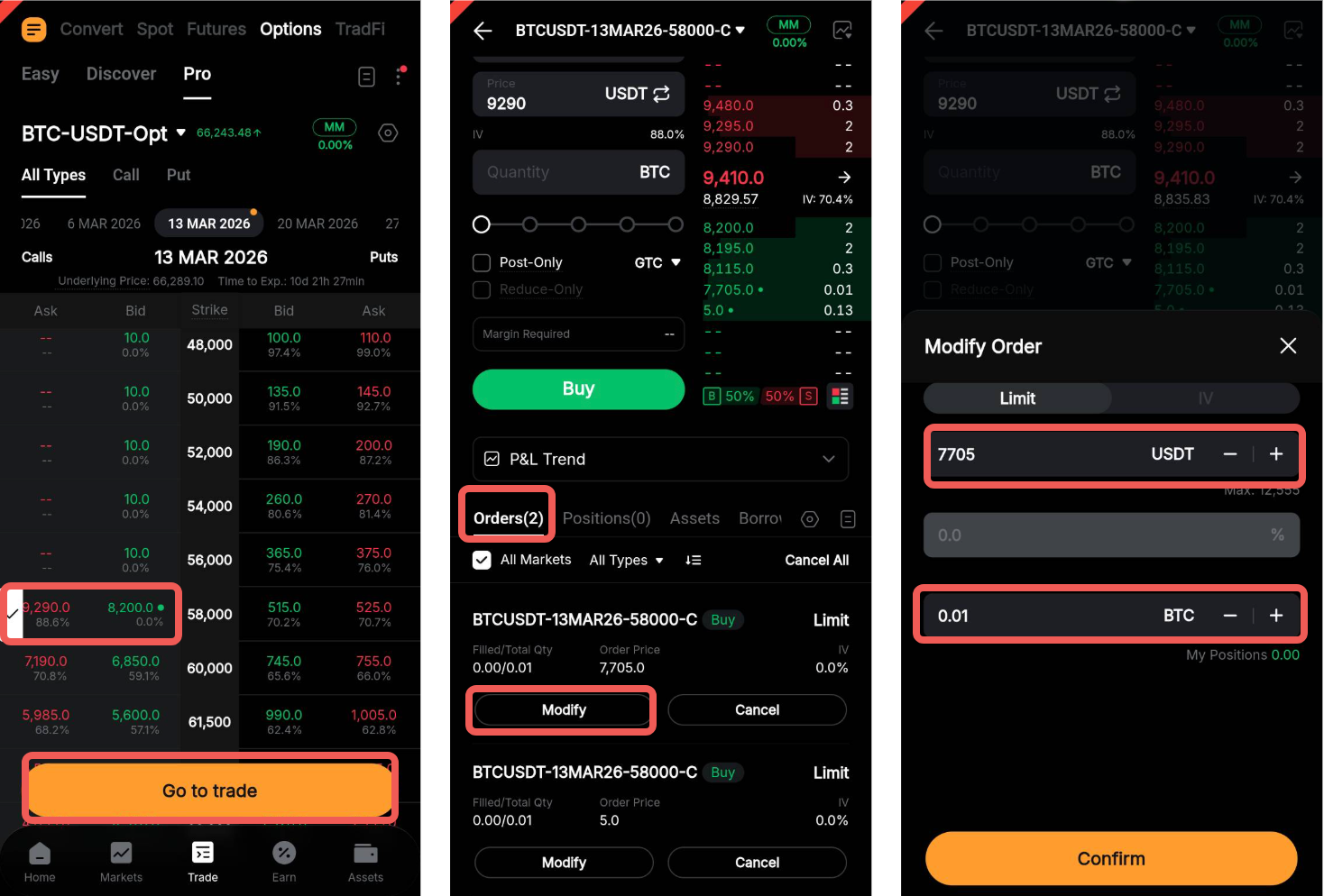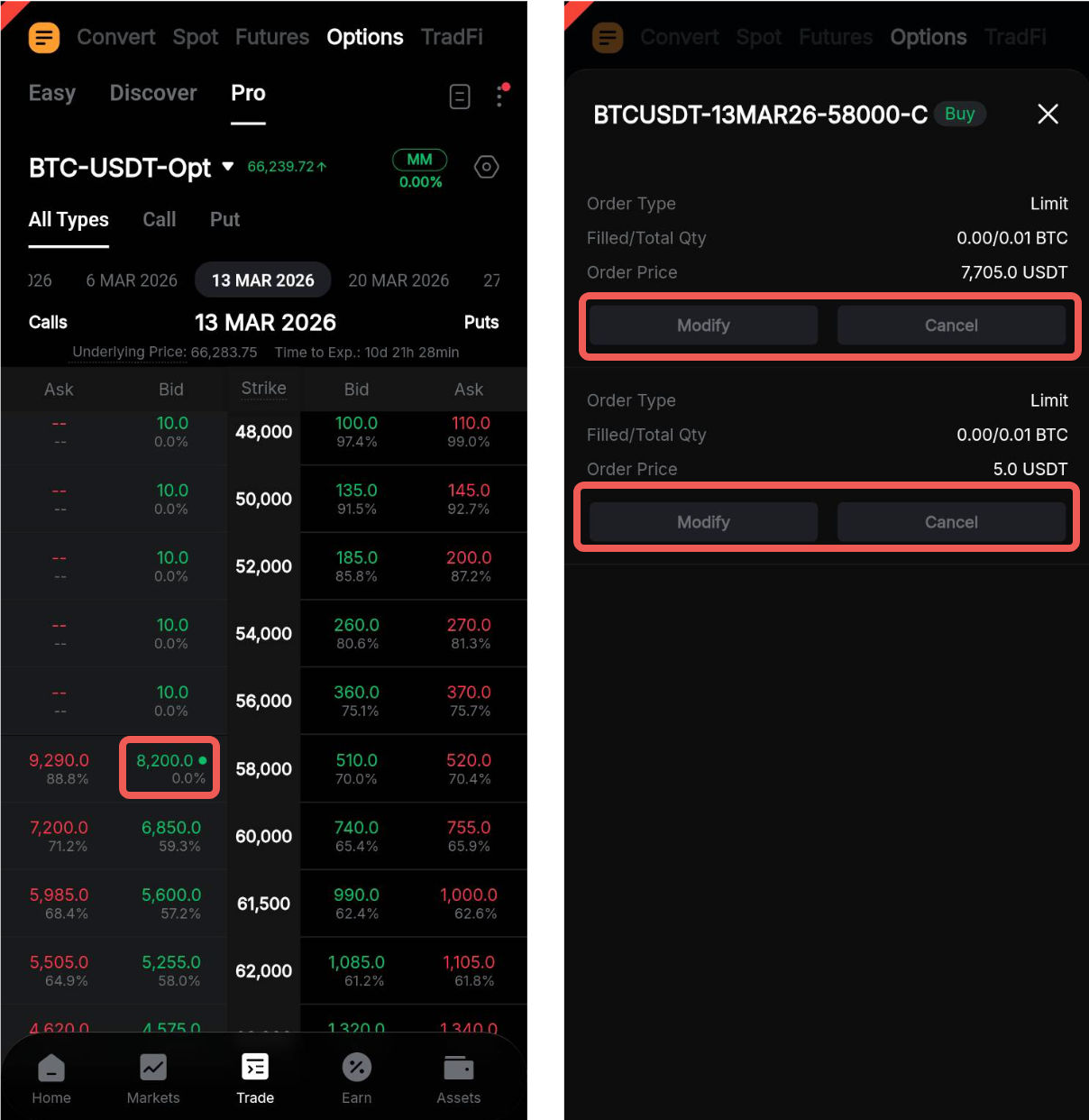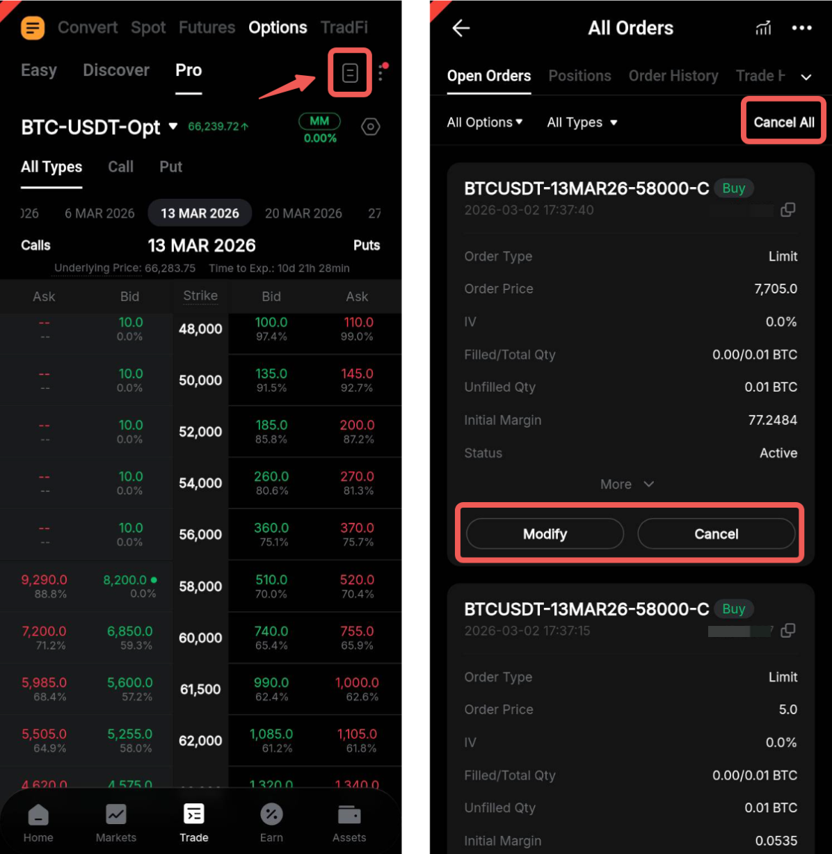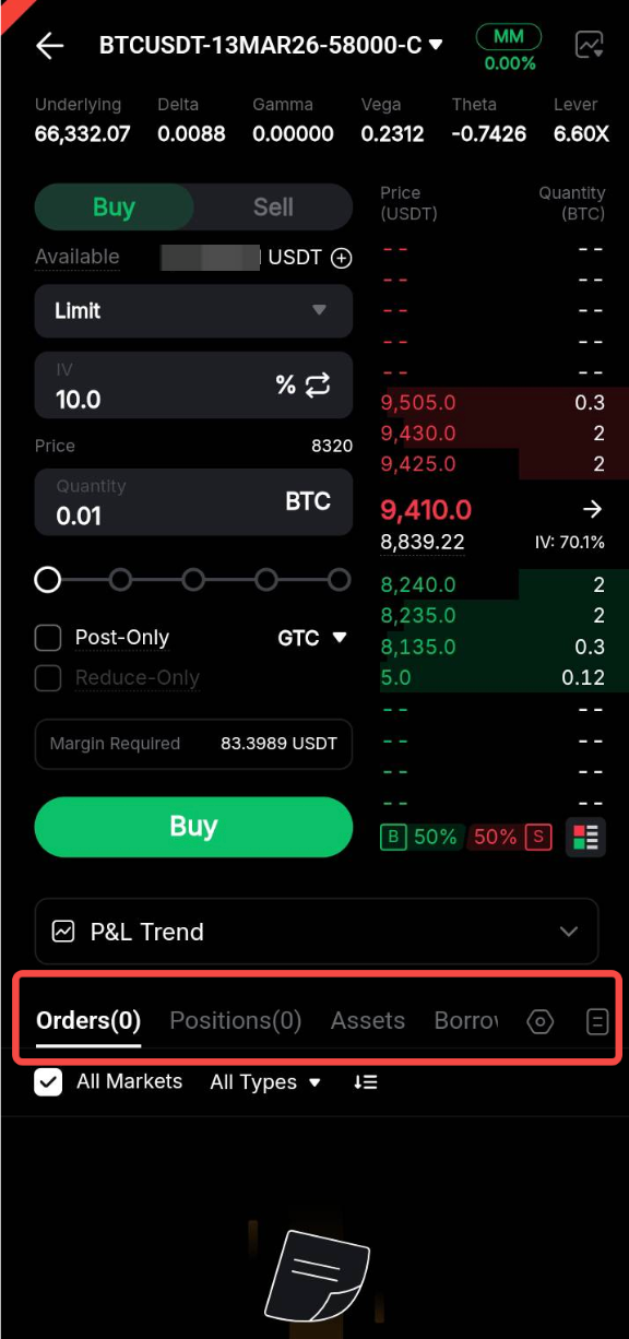 Vaya a la pestaña Órdenes en el Subpanel de trade. Toque Modificar para la orden correspondiente para actualizar los parámetros de la orden, incluido el Precio de la orden o la IV (%) (dependiendo del parámetro seleccionado durante la colocación de la orden), así como la cantidad del contrato.