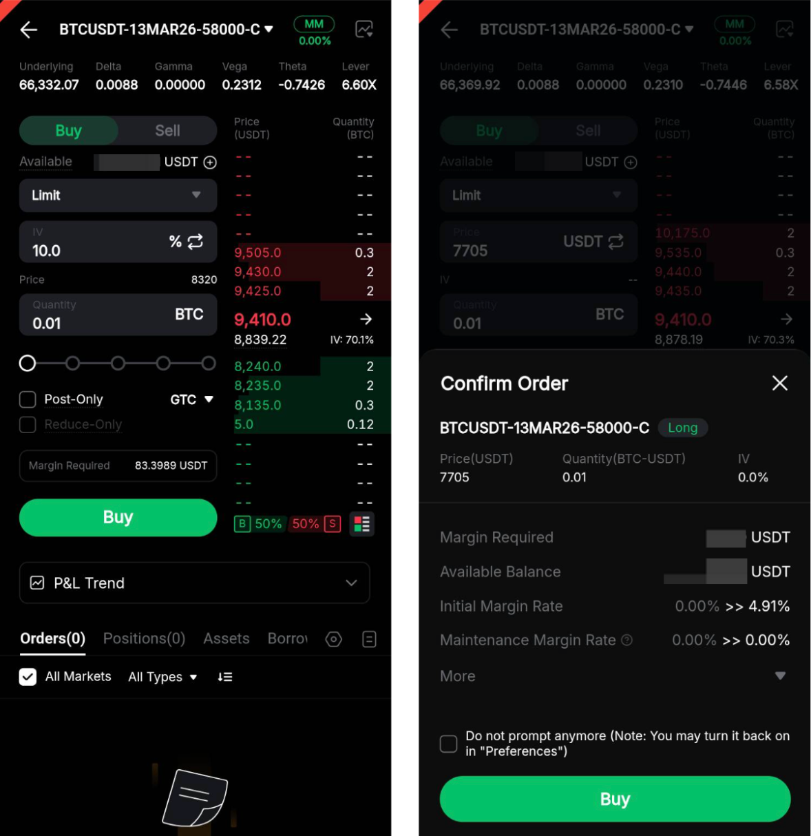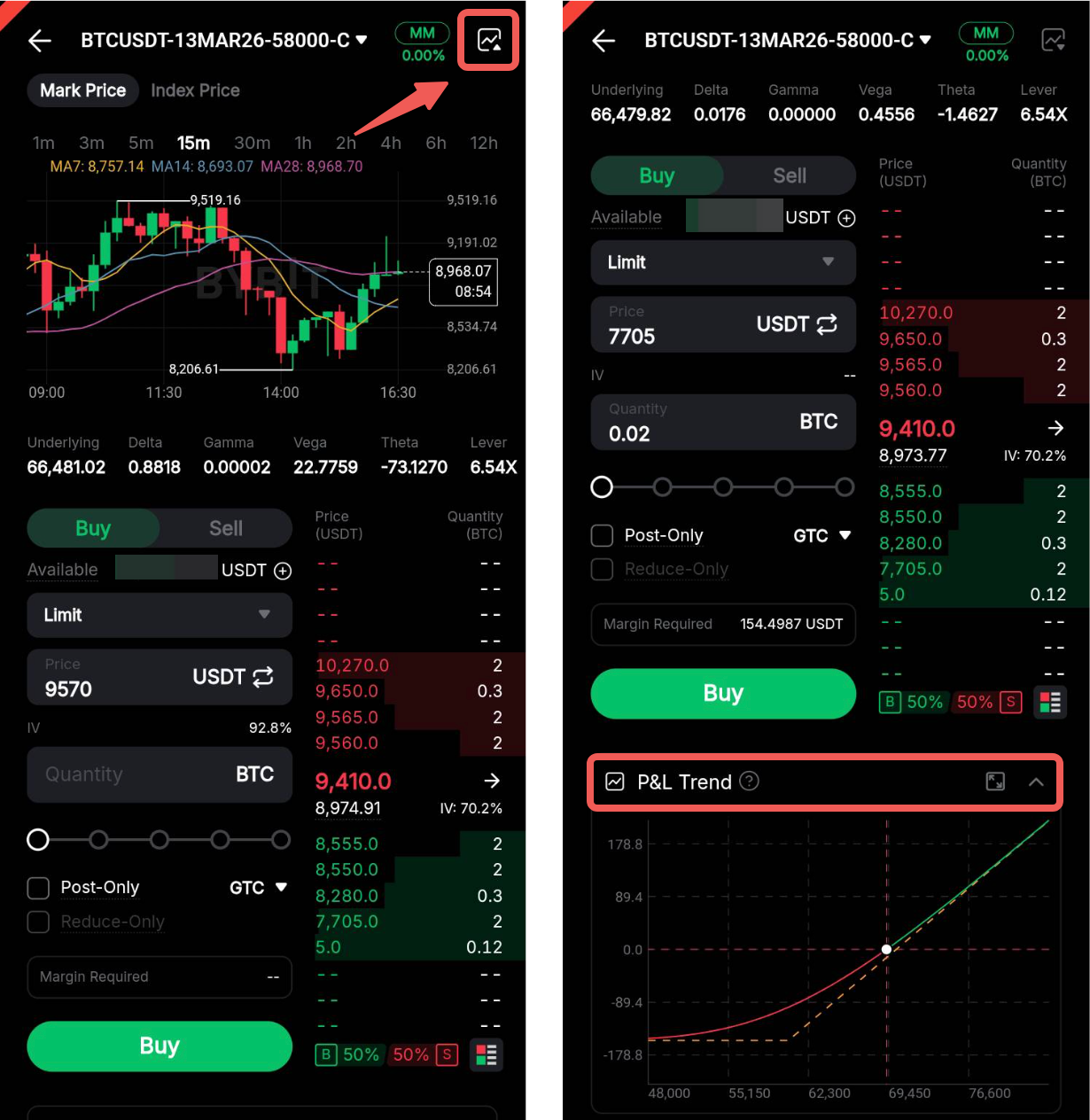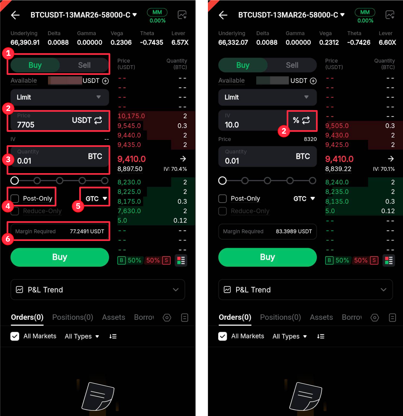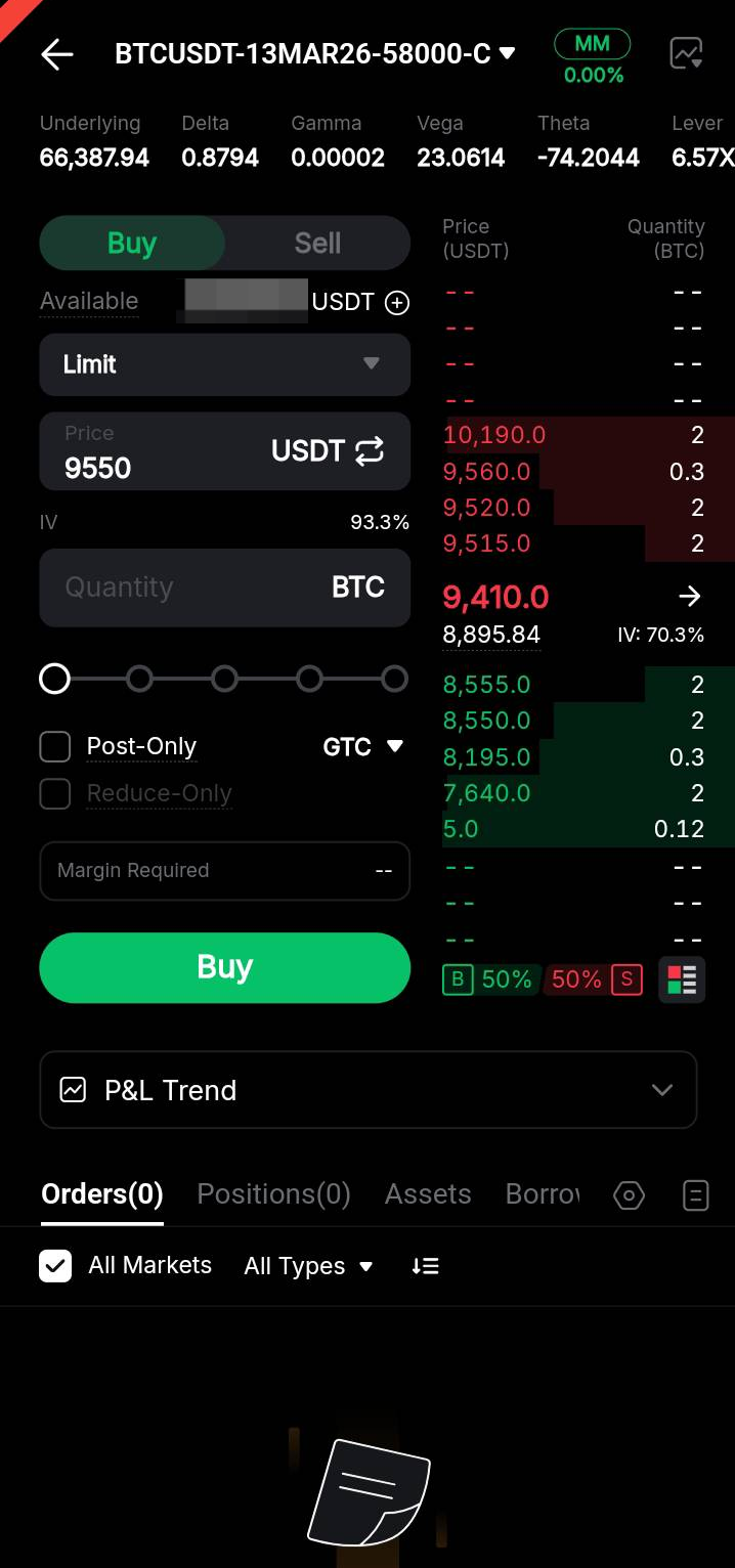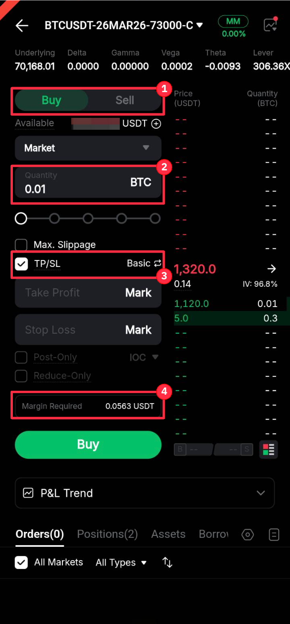 Paso 3: En la página de colocación de órdenes, puede ver los precios de compra/venta y los detalles clave del contrato, como la Volatilidad implícita (IV), Delta, Gamma y más.