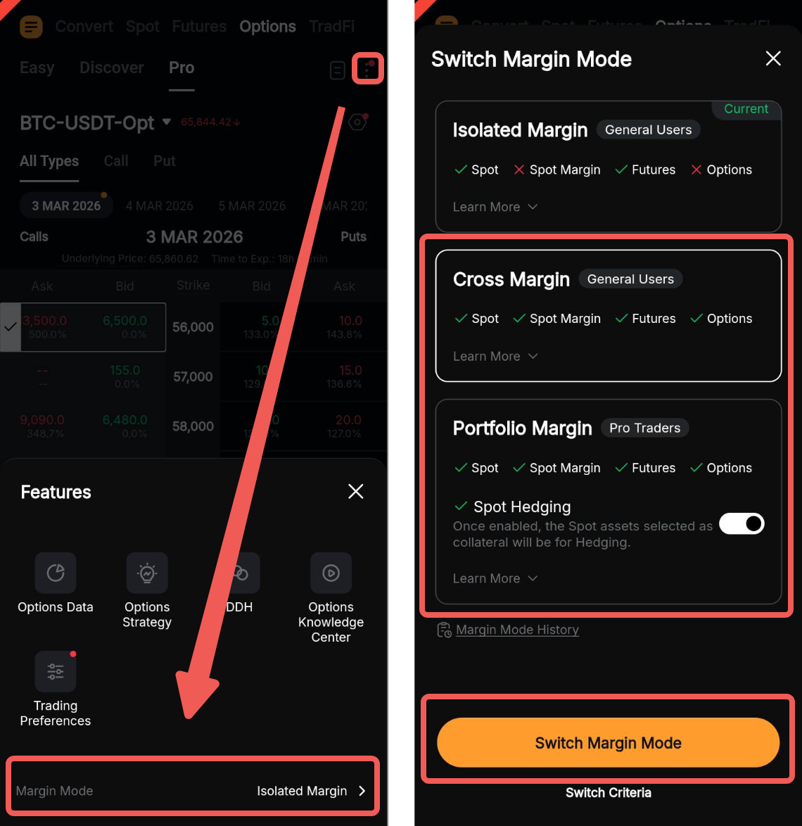 Para cambiar a un modo de margen compatible, vaya a Trade → Opciones, toque el icono de puntos suspensivos → Margen Aislado, luego elija su modo de margen preferido y toque Cambiar modo de margen para confirmar.