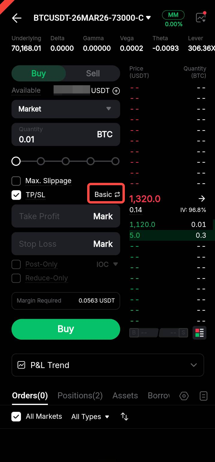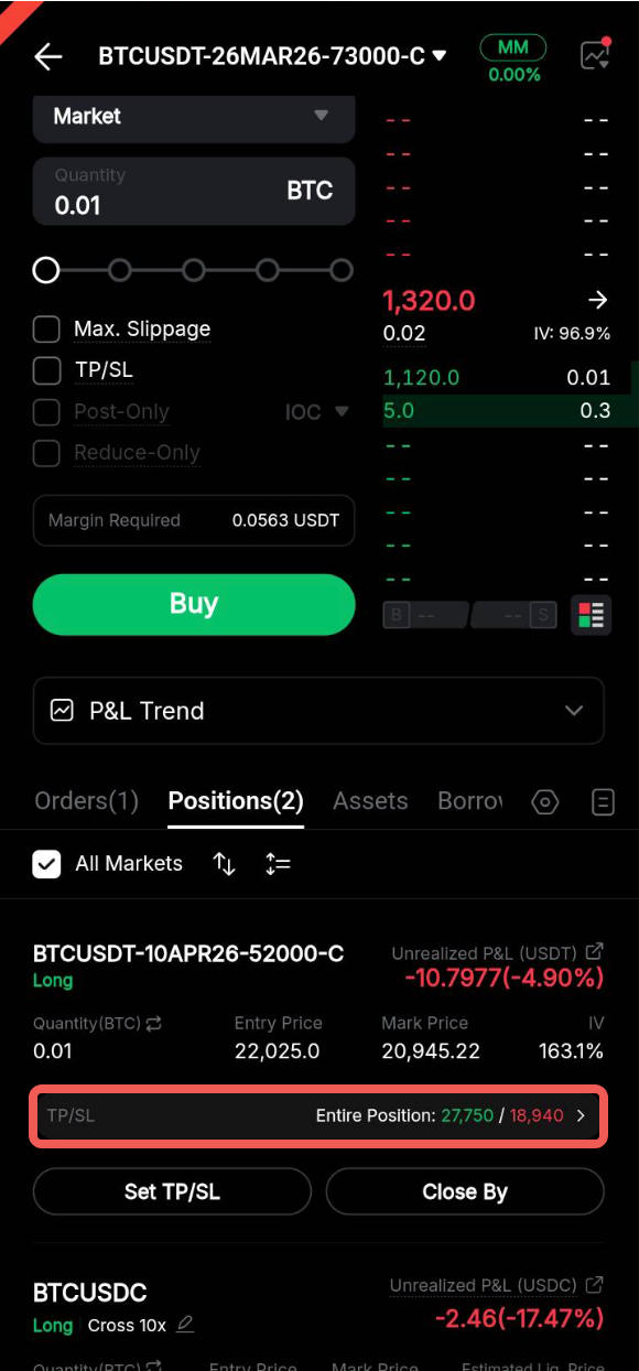 Actualmente, las órdenes TP/SL para Opciones solo están disponibles para órdenes de mercado y no son compatibles con las órdenes límite.