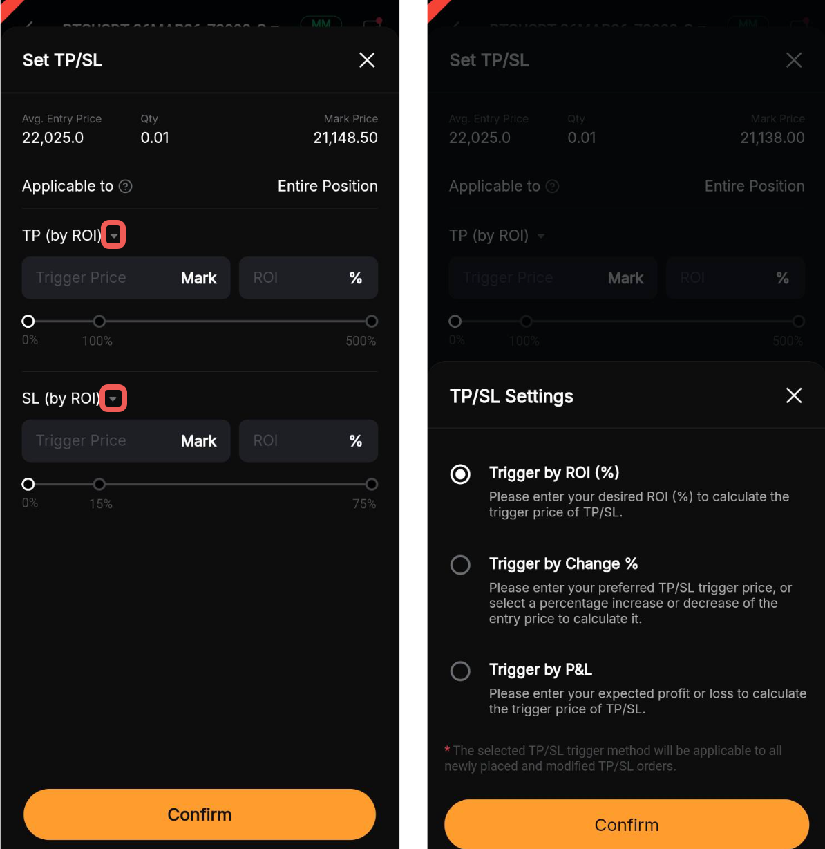 Paso 2: Seleccione su modo de activación de TP/SL preferido: Por ROI (%), por cambio (%) o por P&L.