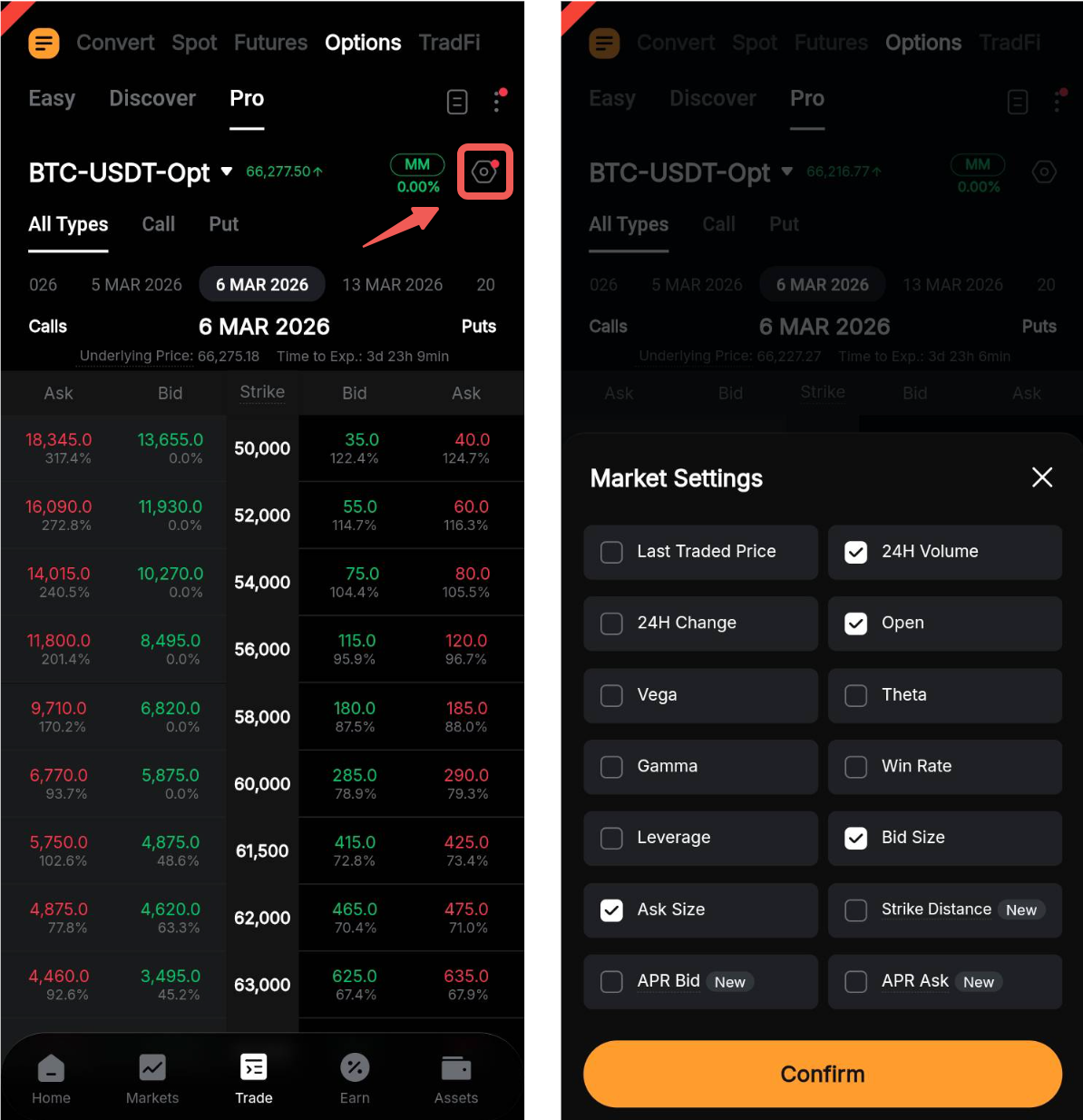 Para personalizar la configuración del mercado en su Cadena de opciones, toque el icono de Configuración y seleccione o anule la selección de las opciones según sea necesario. Los ajustes disponibles incluyen Último precio operado, Griegas de opciones, Distancia de strike, APR de compra/venta y más.