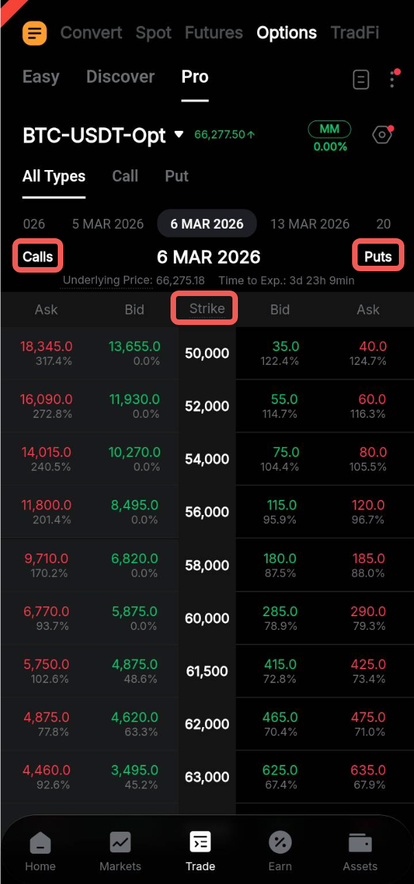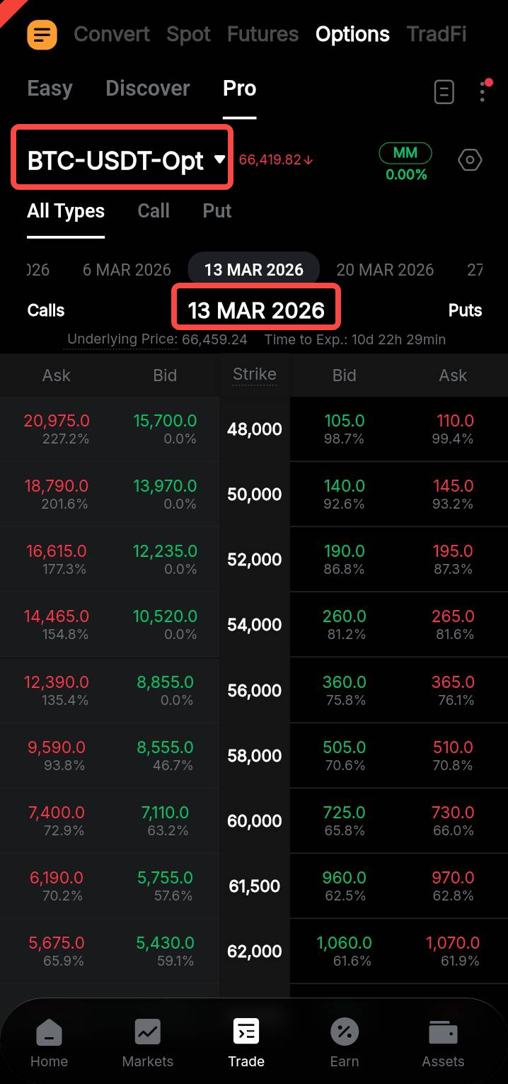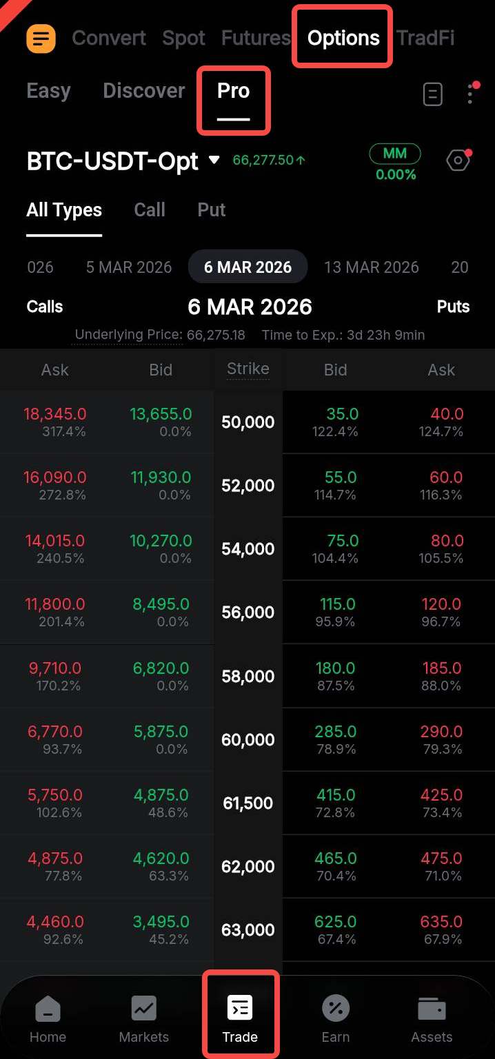 En la página de inicio de la aplicación de Bybit, vaya a Trade y cambie a la pestaña Opciones en el panel de navegación superior.