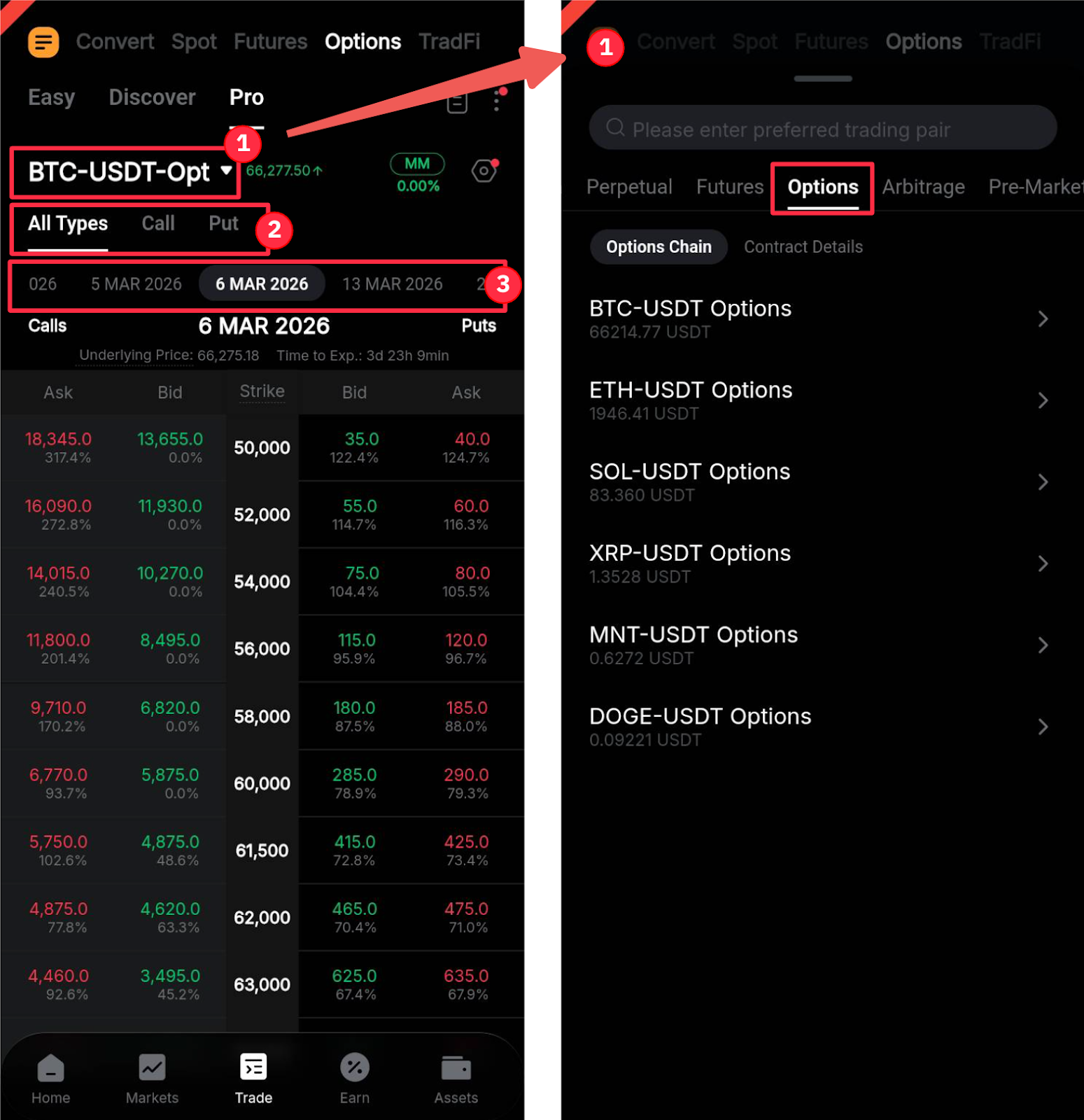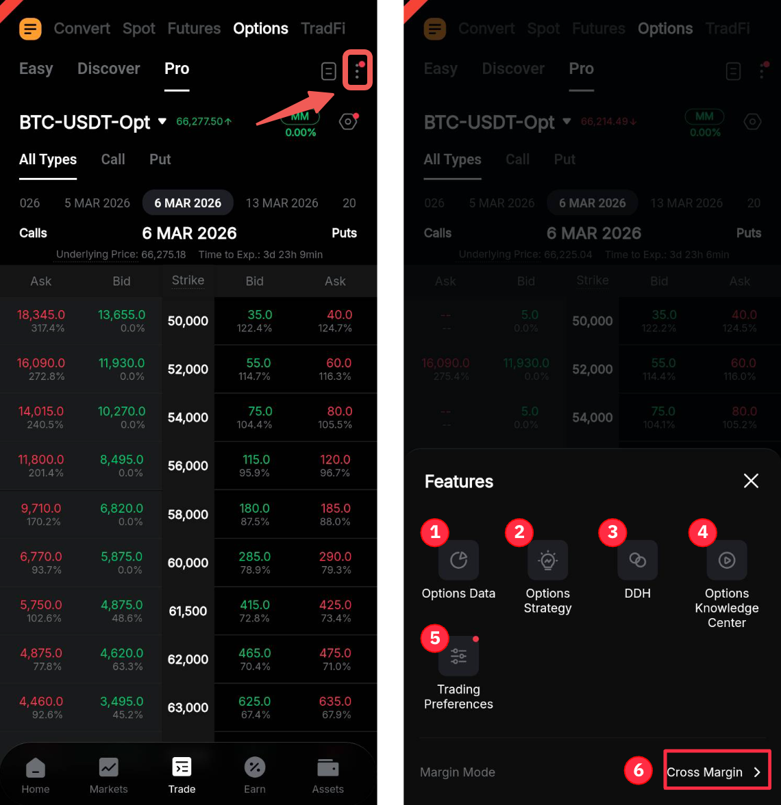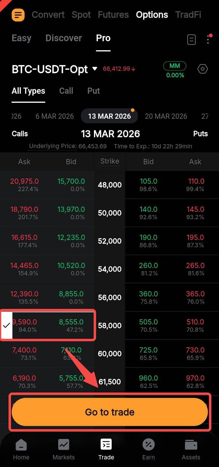 En la página de inicio de la aplicación de Bybit, vaya a Trade y cambie a la pestaña Opciones en el panel de navegación superior.