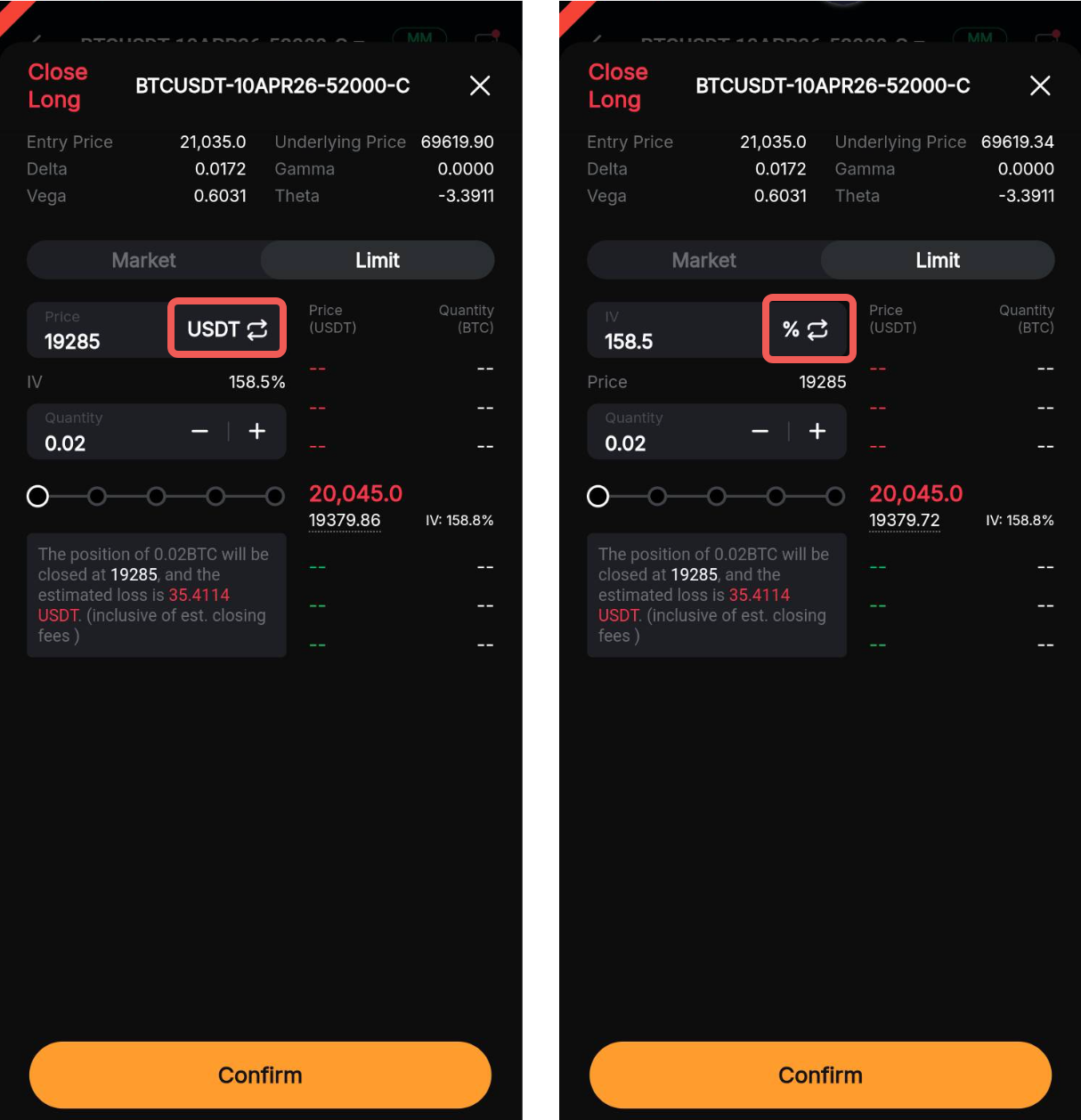 2. Introduzca el precio de la orden o la IV (%). Toque el icono de Cambiar para alternar entre los dos parámetros.