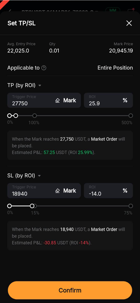 Paso 2: En la ventana Modificar TP/SL, actualice los parámetros de TP/SL según sea necesario y luego pulse Confirmar.