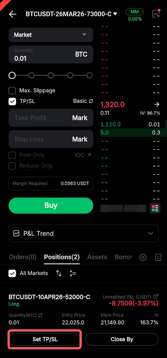 Las Opciones de Bybit admiten órdenes Take Profit (TP) y Stop Loss (SL) para ayudarle a gestionar el riesgo.