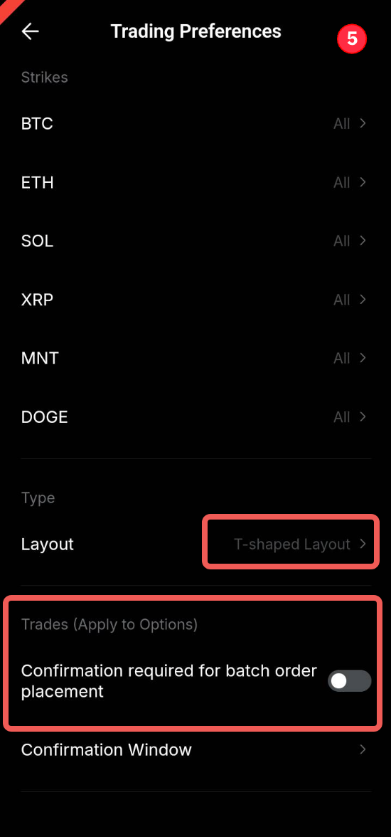 5. Preferencias de trading: Ajuste sus preferencias de trading y el diseño de la Cadena de opciones. También puede habilitar la colocación de órdenes por lotes para órdenes de Opciones de varios tramos.