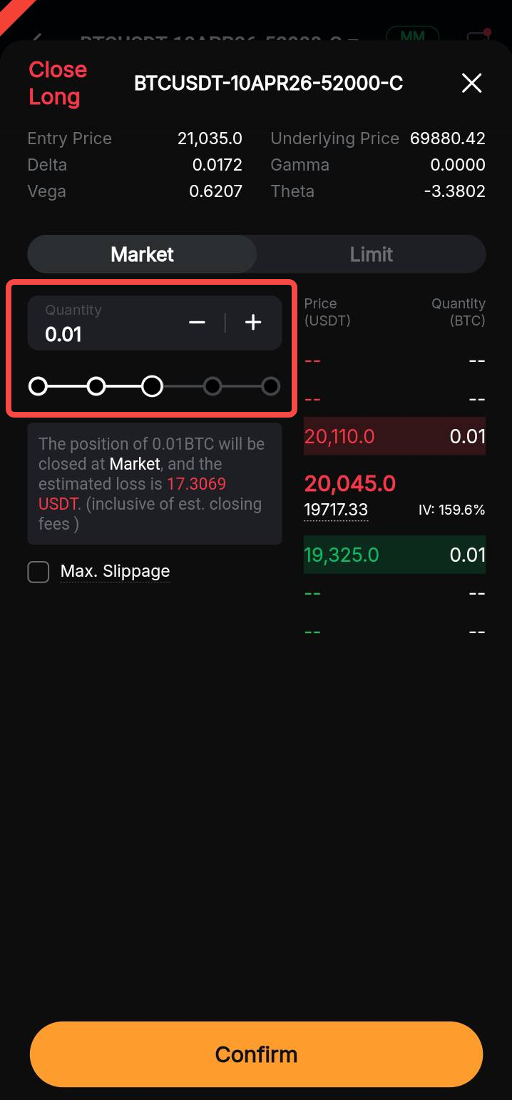 Para cerrar parcialmente una posición, ajuste la cantidad utilizando el control deslizante o el campo de entrada. Tenga en cuenta que el cierre parcial solo está disponible si el tamaño de su posición supera la cantidad mínima de la orden.