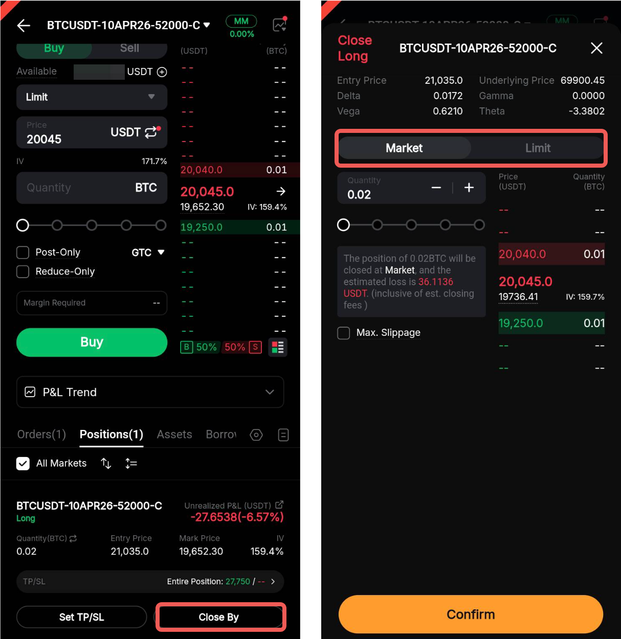 Por ejemplo, si tiene una posición activa de Compra de Call de 1 BTCUSDT-24FEB26-62000-C, deberá colocar una orden de Venta de Call para 1 BTCUSDT-24FEB26-62000-C para cerrar completamente la posición.