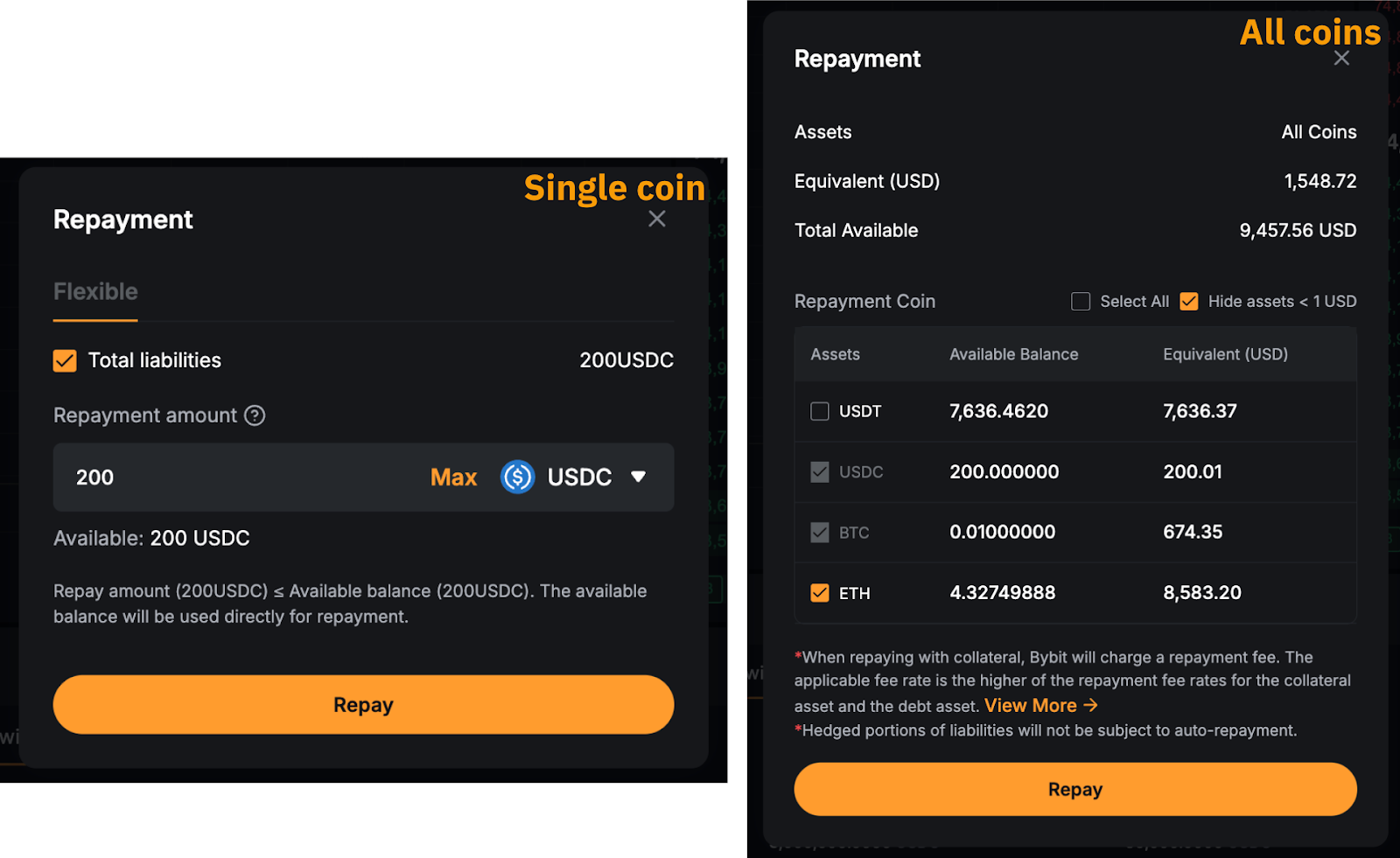 — Ahora se admiten pagos completos, parciales y mixtos (monedas prestadas + conversión). Sin embargo, tenga en cuenta que cualquier reembolso realizado mediante transferencia de activos o trading spot (es decir, la venta de otros activos de margen a la moneda prestada) solo pagará el importe pendiente de sus pasivos derivados. Cualquier pasivo al spot permanecerá y debe pagarse manualmente.
