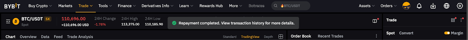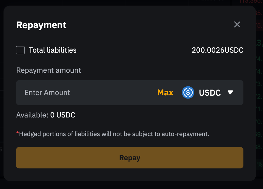 También puede acceder al botón Repagar desde la página de trading de Margen al spot → Préstamos.