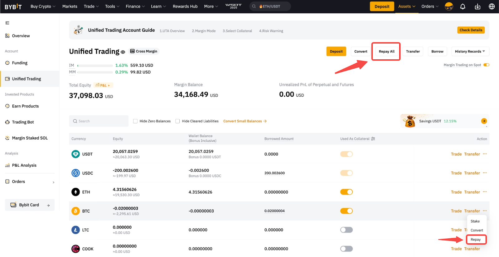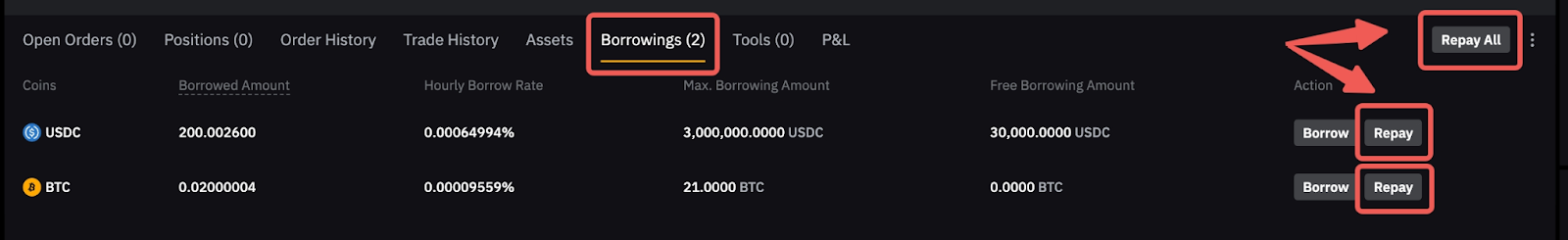 - Para pagar todas las monedas prestadas, haga clic en Pagar todo en la parte superior de la página de trading unificada.