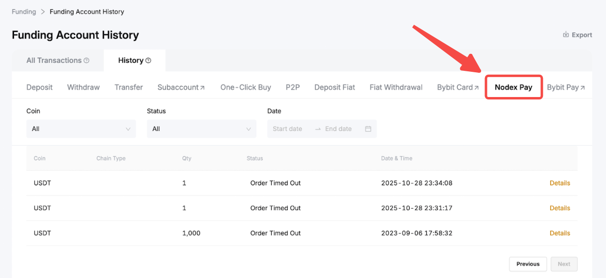 Paso 5: Una vez completada la transacción, puedes ver el registro de la orden en la página Historial de la cuenta de financiación. Para ver sólo los registros de Nodex Pay, simplemente haz clic en Nodex Pay.