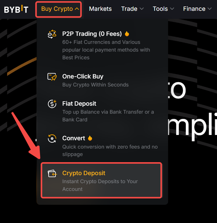 También puedes pasar el cursor sobre Activos en la esquina superior derecha de la página de inicio de Bybit. A continuación, haz clic en Depositar para acceder a la página de depósito.