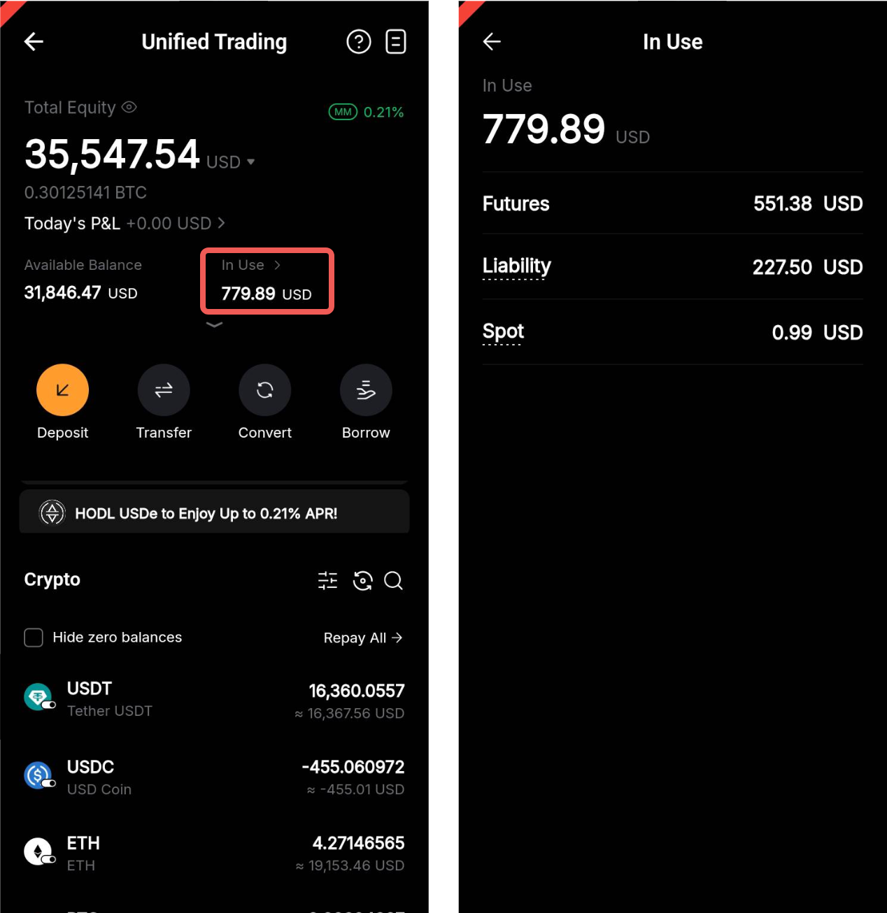 En la Cuenta de trading unificada, "En uso" representa la parte de tu margen actualmente reservada en diferentes productos. Garantiza que tu saldo disponible refleje con precisión todas las actividades y los riesgos de trading en curso.