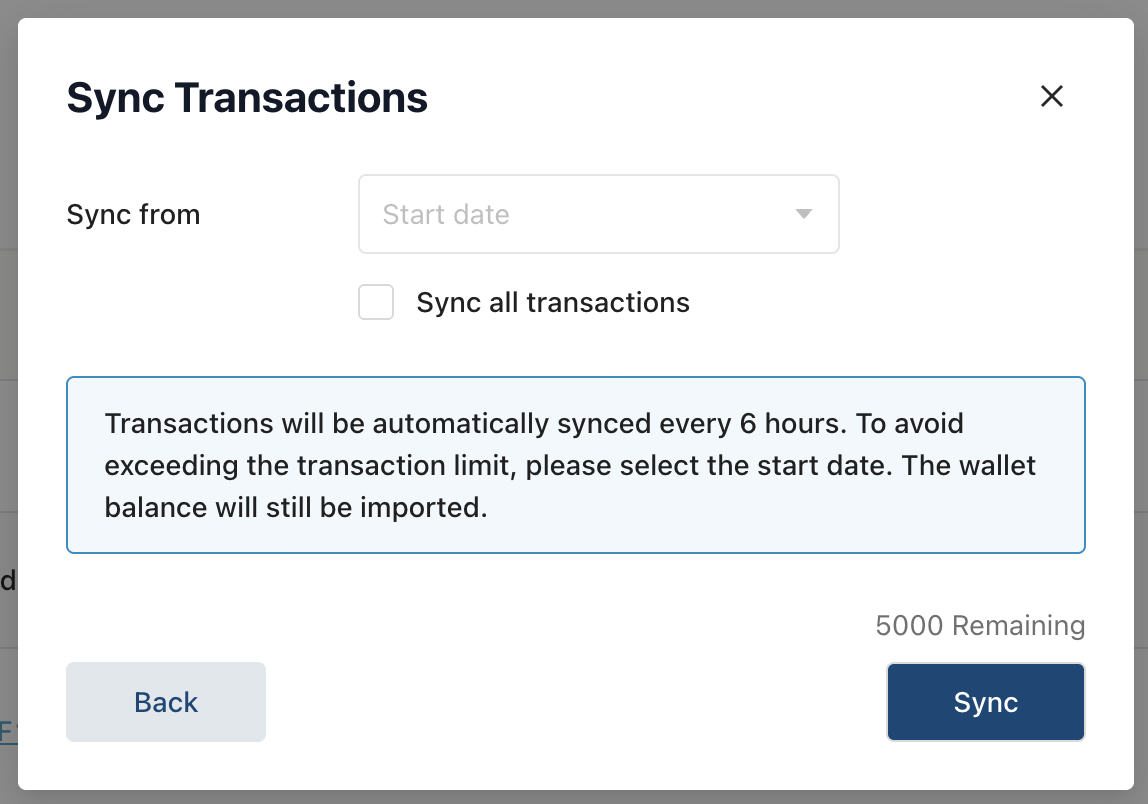 Paso 7: Una vez conectado, Journaler le preguntará qué monederos conectar y le permitirá elegir una fecha de inicio.