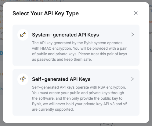 Paso 2: Haga clic en Crear nueva clave. Aparecerá una ventana emergente en la que podrá seleccionar el tipo de clave API que mejor se adapte a sus necesidades de trading.