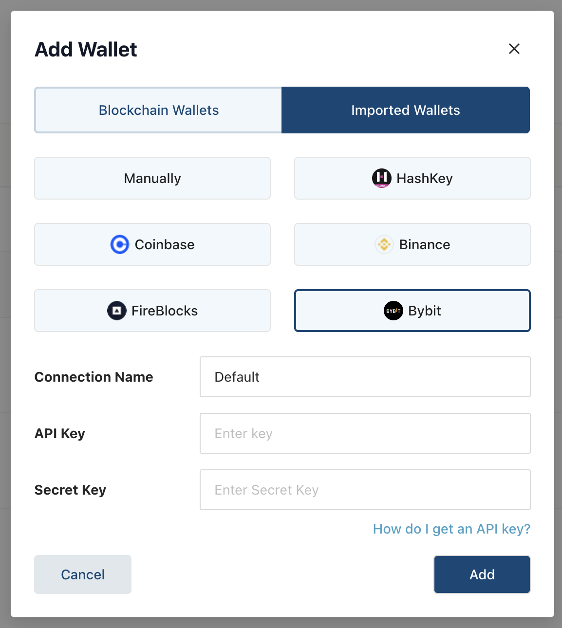 Paso 6: En la ventana emergente, seleccione Bybit e introduzca la información de su clave API de Bybit recién creada. Tendrá que introducir: