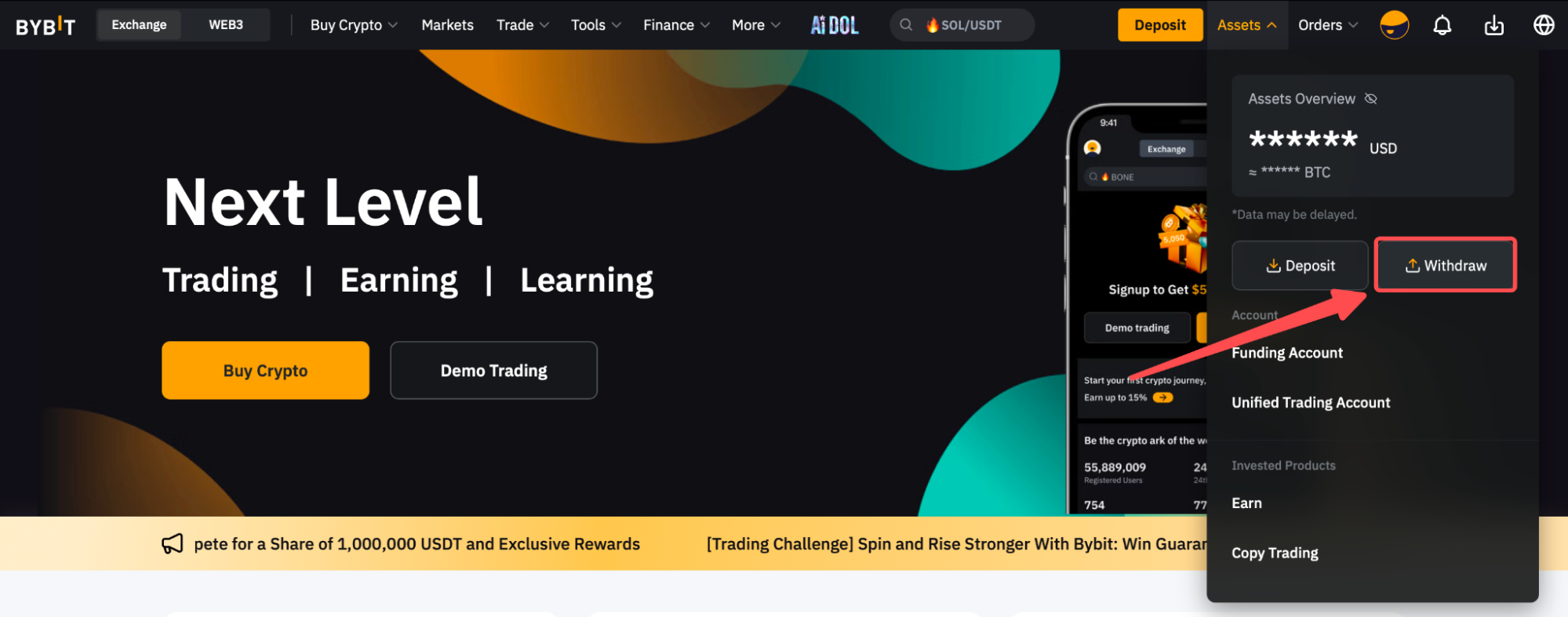 Aquí tienes una guía paso a paso para ayudarte a enviar una solicitud de retiro on-chain. Para retirar fondos mediante transferencia interna, puedes consultar aquí.