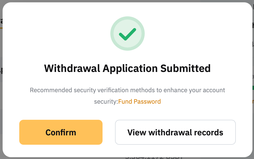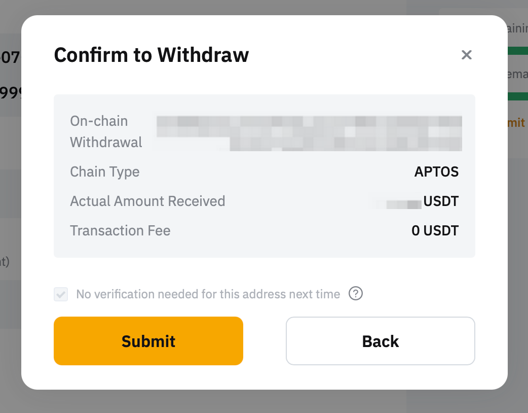 Si tu dirección se verifica en la lista blanca de direcciones de retiro, no tendrás que pasar por el proceso de verificación 2FA y puedes enviar la solicitud de retiro como se indica a continuación. Para verificar la dirección de tu billetera de retiro, puedes seguir esta guía.