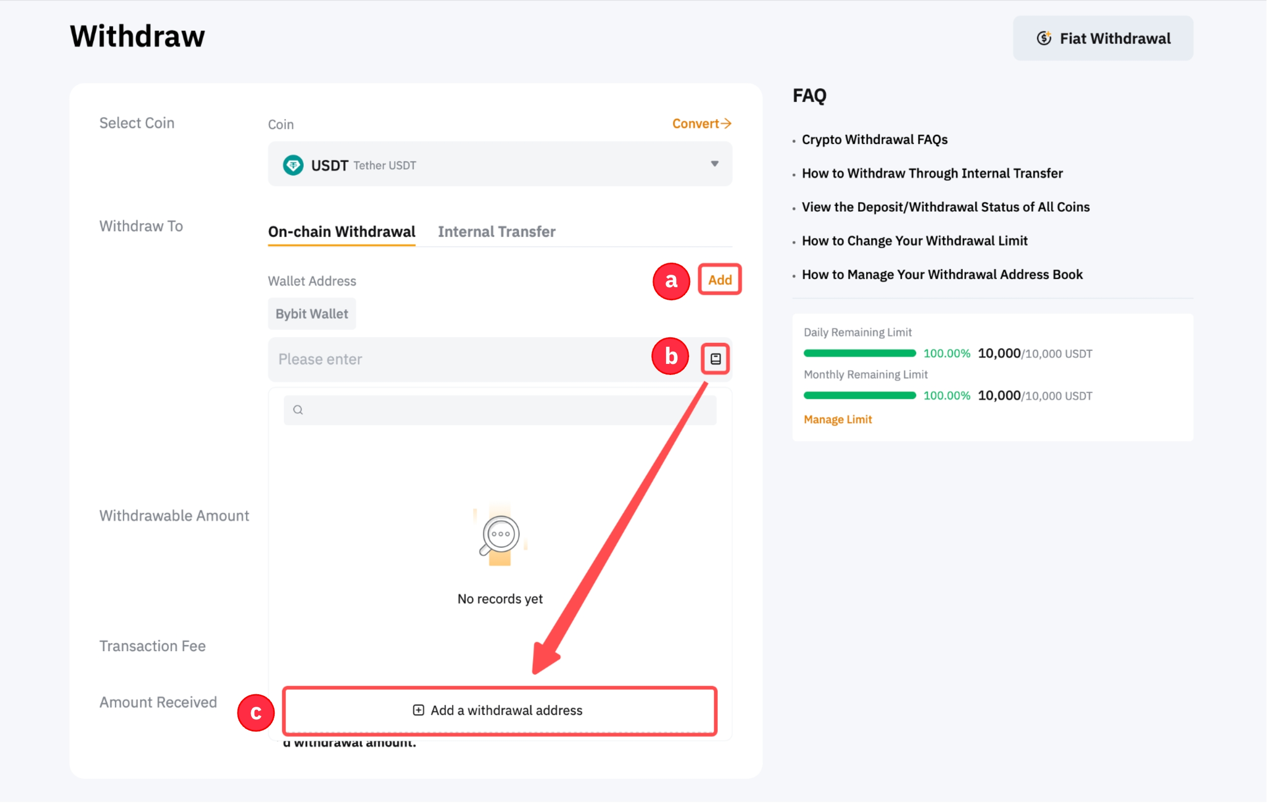 Añade una nueva dirección de billetera de retiro a tu libreta de direcciones de billetera de retiro de Bybit.