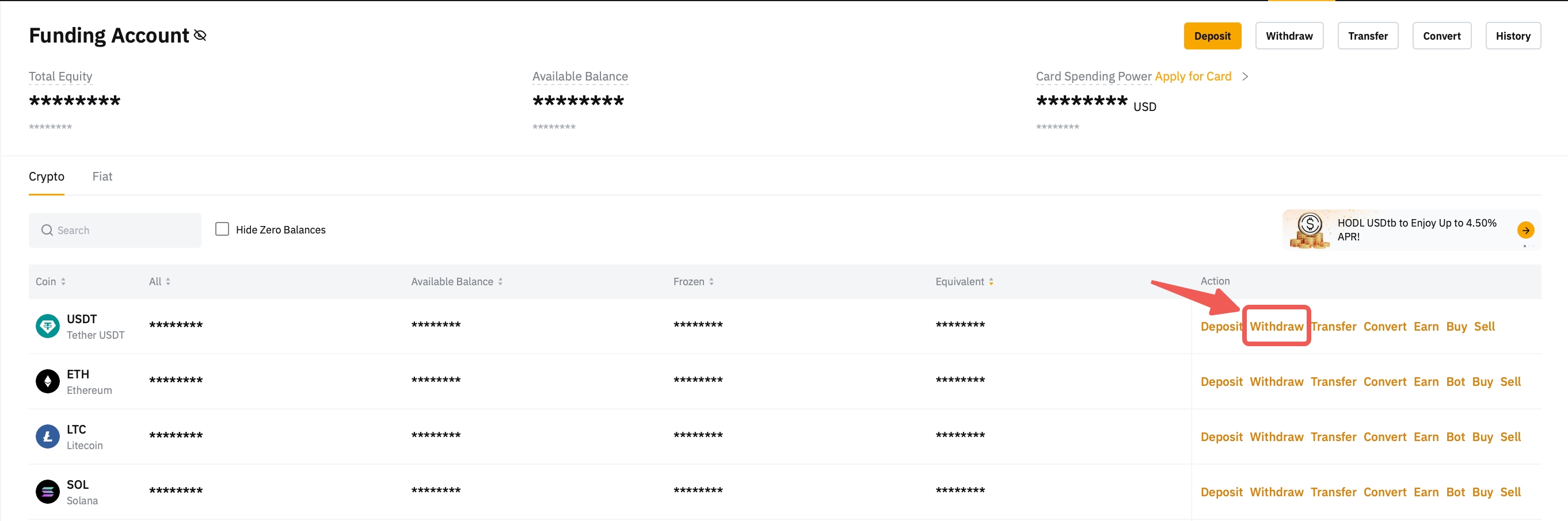 Como alternativa, ve a la cuenta de fondos y haz clic en el botón Retirar en la columna de la moneda que deseas retirar.