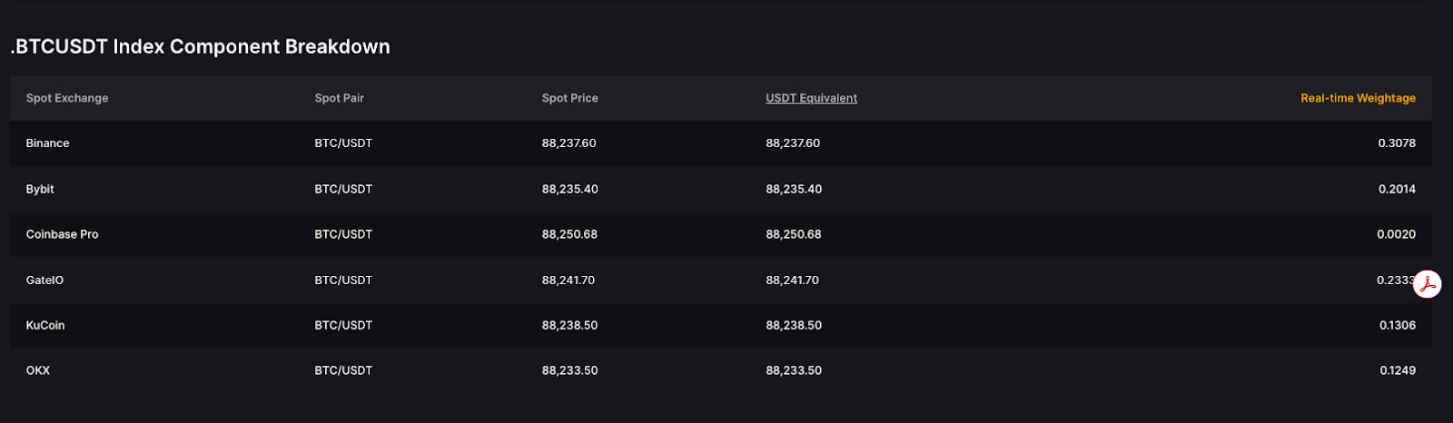 El precio del índice depende de tres (3) variables: Precio spot, Equivalente emparejado con USDT y Ponderación en tiempo real.